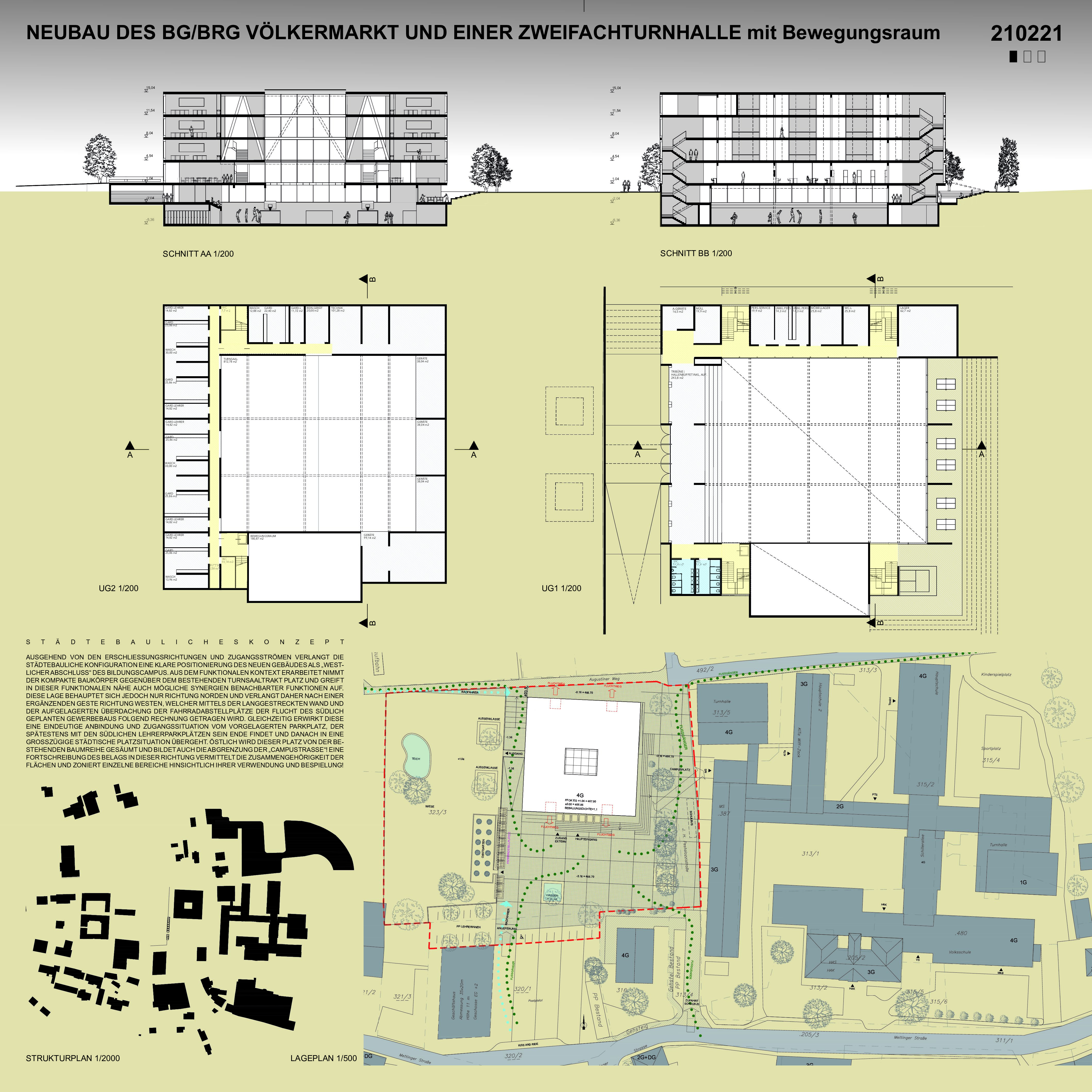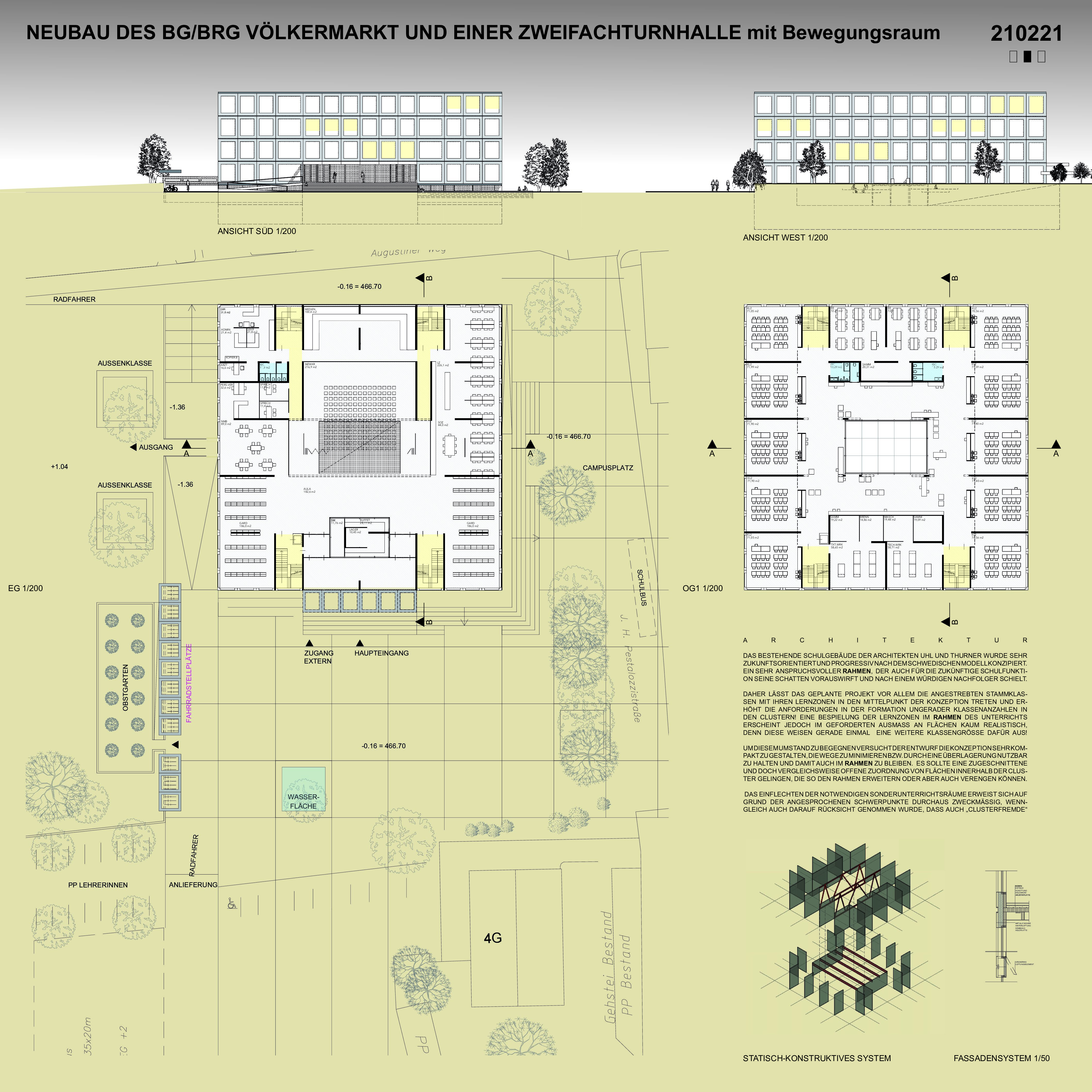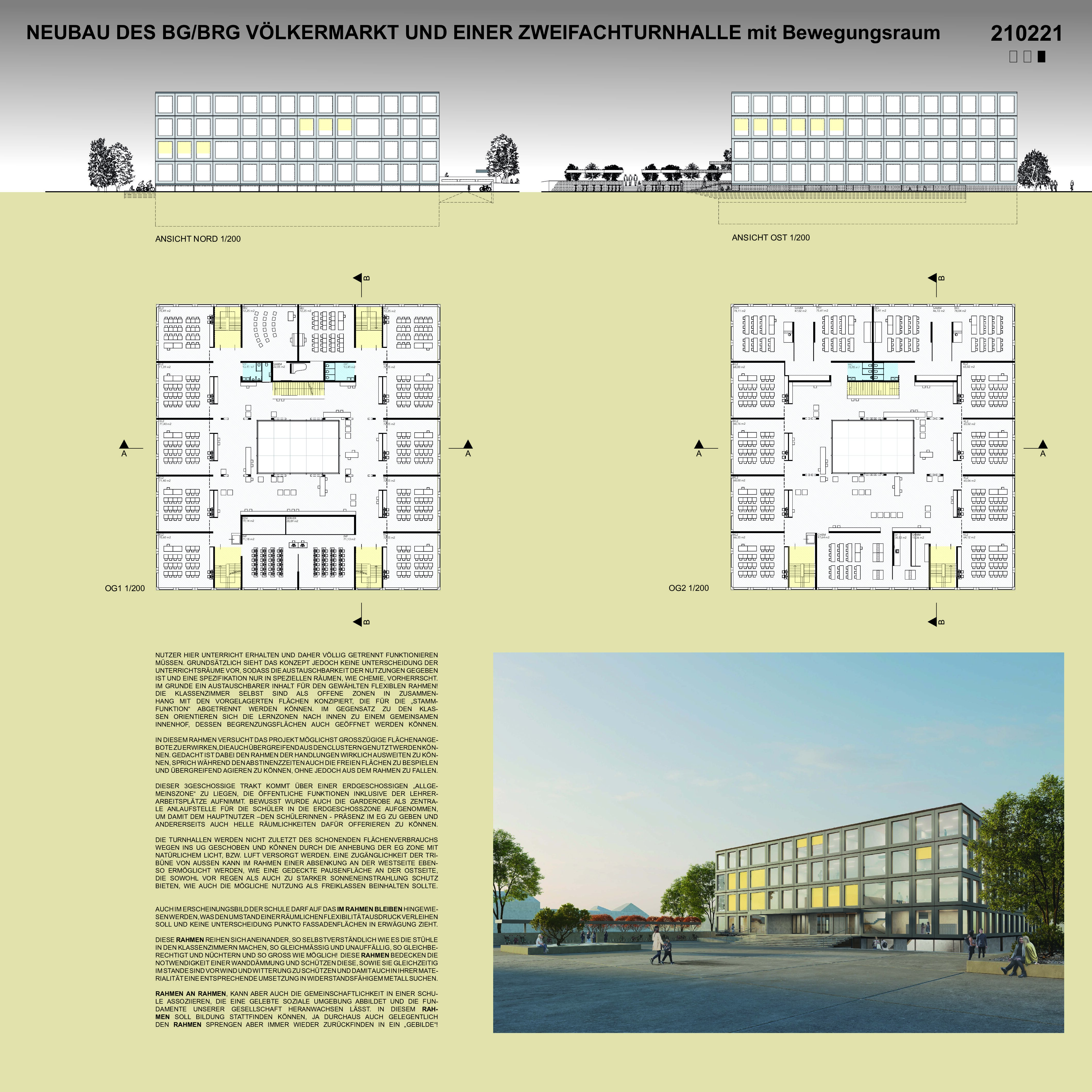 Das bestehende Schulgebäude der Architekten Uhl und Thurner wurde sehr zukunftsorientiert und progressiv nach dem schwedischen Modell konzipiert. Ein sehr anspruchsvoller Rahmen, der auch für die zukünftige Schulfunktion seine Schatten vorauswirft und nach einem würdigen Nachfolger schielt. Daher lässt das geplante Projekt vor allem die angestrebten Stammklassen mit ihren Lernzonen in den Mittelpunkt der Konzeption treten und erhöht die Anforderungen in der Formation ungerader Klassenanzahlen in den Clustern! Eine Bespielung der Lernzonen im RAHMEN des Unterrichts erscheint jedoch im geforderten Ausmaß an Flächen kaum realistisch, denn diese weisen gerade einmal eine weitere Klassengröße dafür aus! Um diesem Umstand zu begegnen versucht der Entwurf die Konzeption sehr kompakt zu gestalten, die Wege zu minimieren bzw. durch eine Überlagerung nutzbar zu halten und damit auch im Rahmen zu bleiben. Es sollte eine zugeschnittene und doch vergleichsweise offene Zuordnung von Flächen innerhalb der Cluster gelingen, die so den RAHMEN erweitern oder aber auch verengen können. Das Einflechten der notwendigen Sonderunterrichtsräume erweist sich auf Grund der angesprochenen Schwerpunkte durchaus zweckmäßig, wenngleich auch darauf Rücksicht genommen wurde, dass auch „Clusterfremde“ Nutzer hier Unterricht erhalten und daher völlig getrennt funktionieren müssen. Grundsätzlich sieht das Konzept jedoch keine Unterscheidung der Unterrichtsräume vor, sodass die Austauschbarkeit der Nutzungen gegeben ist und eine Spezifikation nur in speziellen Räumen, wie Chemie, vorherrscht. Im Grunde ein austauschbarer Inhalt für den gewählten flexiblen Rahmen. Die Klassenzimmer selbst sind als offene Zonen in Zusammenhang mit den vorgelagerten Flächen konzipiert, die für die „Stammfunktion“ abgetrennt werden können. Im Gegensatz zu den Klassen orientieren sich die Lernzonen nach innen zu einem gemeinsamen Innenhof, dessen Begrenzungsflächen auch geöffnet werden können. In diesem Rahmen versucht das Projekt möglichst großzügige Flächenangebote zu erwirken, die auch übergreifend aus den Clustern genutzt werden können. Gedacht ist dabei den Rahmen der Handlungen wirklich ausweiten zu können, sprich während den Abstinenzzeiten auch die freien Flächen zu bespielen und übergreifend agieren zu können, ohne jedoch aus dem Rahmen zu fallen. Dieser 3geschoßige Trakt kommt über einer erdgeschossigen „Allgemeinszone“ zu **liegen, die öffentliche Funktionen inklusive der Lehrerarbeitsplätze aufnimmt. Bewusst wurde auch die Garderobe als zentrale Anlaufstelle für die Schüler in die Erdgeschoßzone aufgenommen, um damit dem Hauptnutzer –den Schülerinnen – Präsenz im EG zu geben und andererseits auch helle Räumlichkeiten dafür offerieren zu können. Die Turnhallen werden nicht zuletzt des schonenden Flächenverbrauchs wegen ins UG geschoben und können durch die Anhebung der EG Zone mit natürlichem Licht, bzw. Luft versorgt werden. Eine Zugänglichkeit der Tribüne von außen kann im Rahmen einer Absenkung an der Westseite ebenso ermöglicht werden, wie eine gedeckte Pausenfläche an der Ostseite, die sowohl vor Regen als auch zu starker Sonneneinstrahlung Schutz bieten, wie auch die mögliche Nutzung als Freiklassen beinhalten sollte. Auch im Erscheinungsbild der Schule darf auf das im Rahmen bleiben hingewiesen werden, was den Umstand einer räumlichen Flexibilität Ausdruck verleihen soll und keine Unterscheidung punkto Fassadenflächen in Erwägung zieht. Diese Rahmen reihen sich aneinander, so selbstverständlich wie es die Stühle in den Klassenzimmern machen, so gleichmäßig und unauffällig, so gleichberechtigt und nüchtern und so groß wie möglich. Diese Rahmen bedecken die Notwendigkeit einer Wanddämmung und schützen diese, sowie sie gleichzeitig im Stande sind vor Wind und Witterung zu schützen und damit auch in Ihrer Materialität eine entsprechende Umsetzung in widerstandsfähigem Metall suchen. Rahmen an Rahmen, kann aber auch die Gemeinschaftlichkeit in einer Schule assoziieren, die eine gelebte soziale Umgebung abbildet und die Fundamente unserer Gesellschaft heranwachsen lässt. In diesem Rahmen soll Bildung stattfinden können, ja durchaus auch gelegentlich den Rahmen sprengen aber immer wieder zurückfinden in ein „Gebilde“.