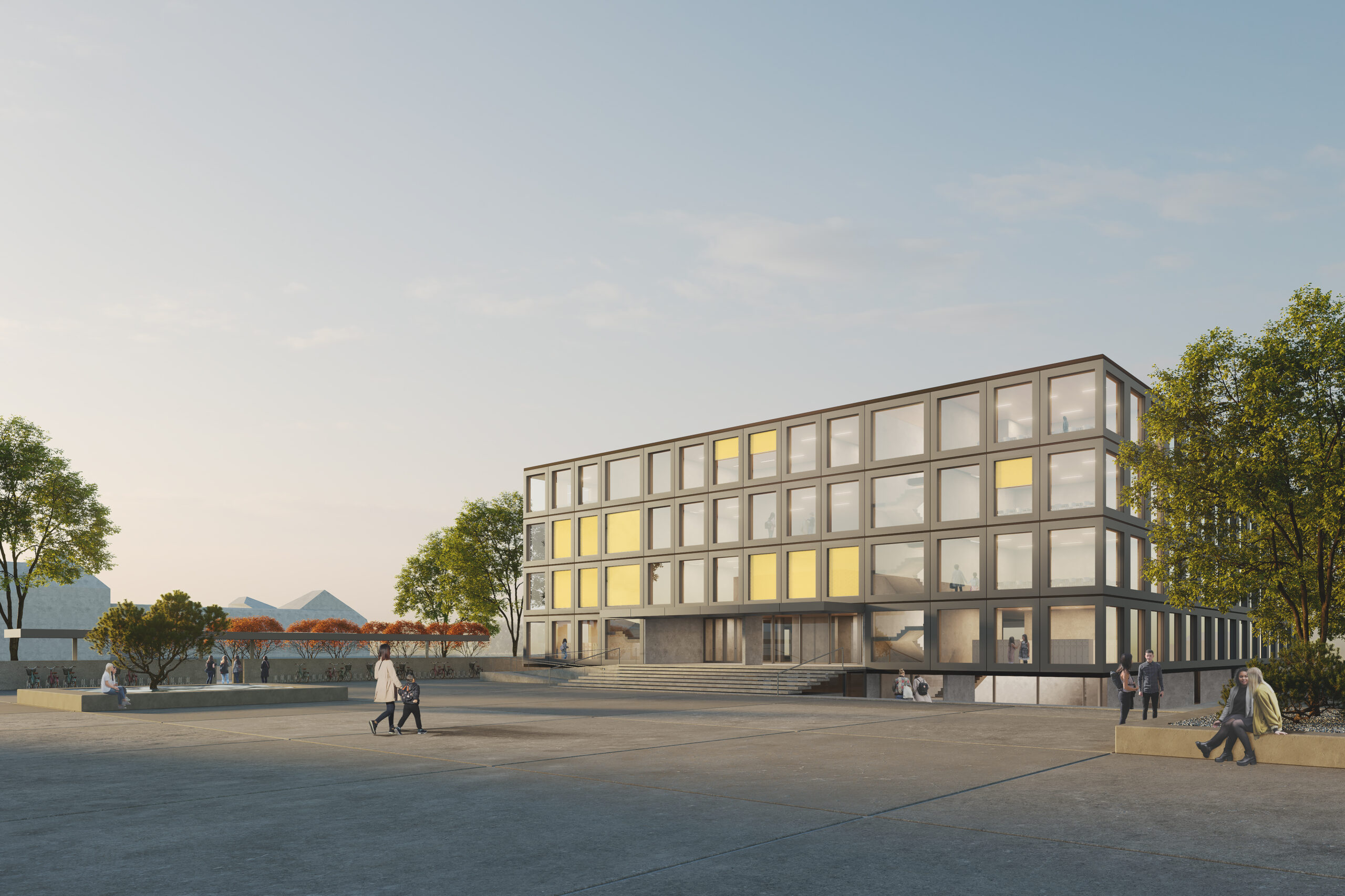 Ausgehend von den Erschliessungsrichtungen und Zugangsströmen verlangt die städtebauliche Konfiguration eine klare Positionierung des neuen Gebäudes als „westlicher Abschluss“ des Bildungscampus. Aus dem funktionalen Kontext erarbeitet nimmt der kompakte Baukörper gegenüber dem bestehenden Turnsaaltrakt Platz und greift in dieser funktionalen Nähe auch mögliche Synergien benachbarter Funktionen auf. Diese Lage behauptet sich jedoch nur Richtung Norden und verlangt daher nach einer ergänzenden Geste Richtung Westen, welcher mittels der langgestreckten Wand und der aufgelagerten Überdachung der Fahrradabstellplätze der Flucht des südlich geplanten Gewerbebaus folgend Rechnung getragen wird. Gleichzeitig erwirkt diese eine eindeutige Anbindung und Zugangssituation vom vorgelagerten Parkplatz, der spätestens mit den südlichen Lehrerparkplätzen sein Ende findet und danach in eine großzügige städtische Platzsituation übergeht. Östlich wird dieser Platz von der bestehenden Baumreihe gesäumt und bildet auch die Abgrenzung der „Campustrasse“! Eine Fortschreibung des Belags in dieser Richtung vermittelt die Zusammengehörigkeit der Flächen und zoniert einzelne Bereiche hinsichtlich Ihrer Verwendung und Bespielung.