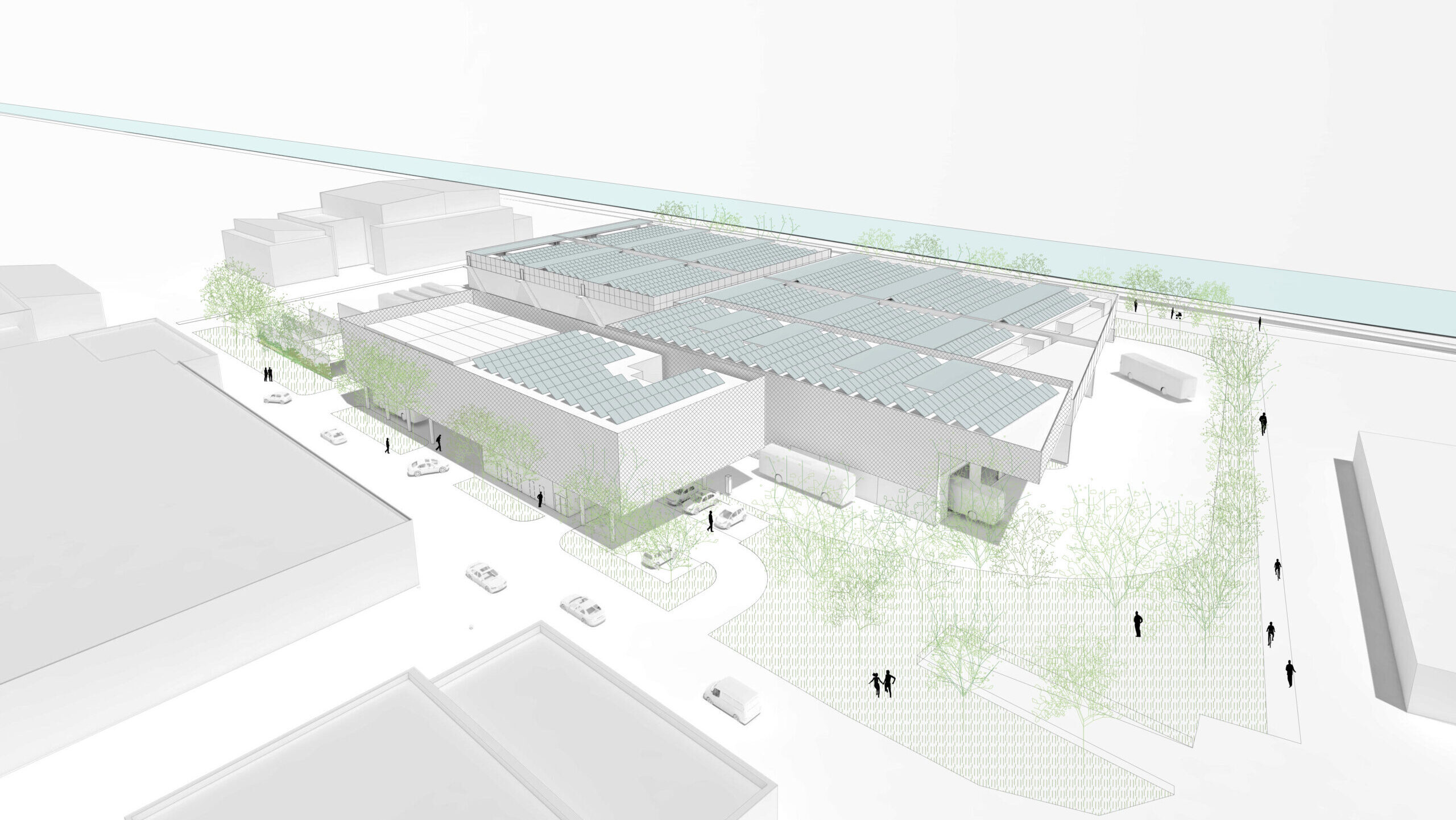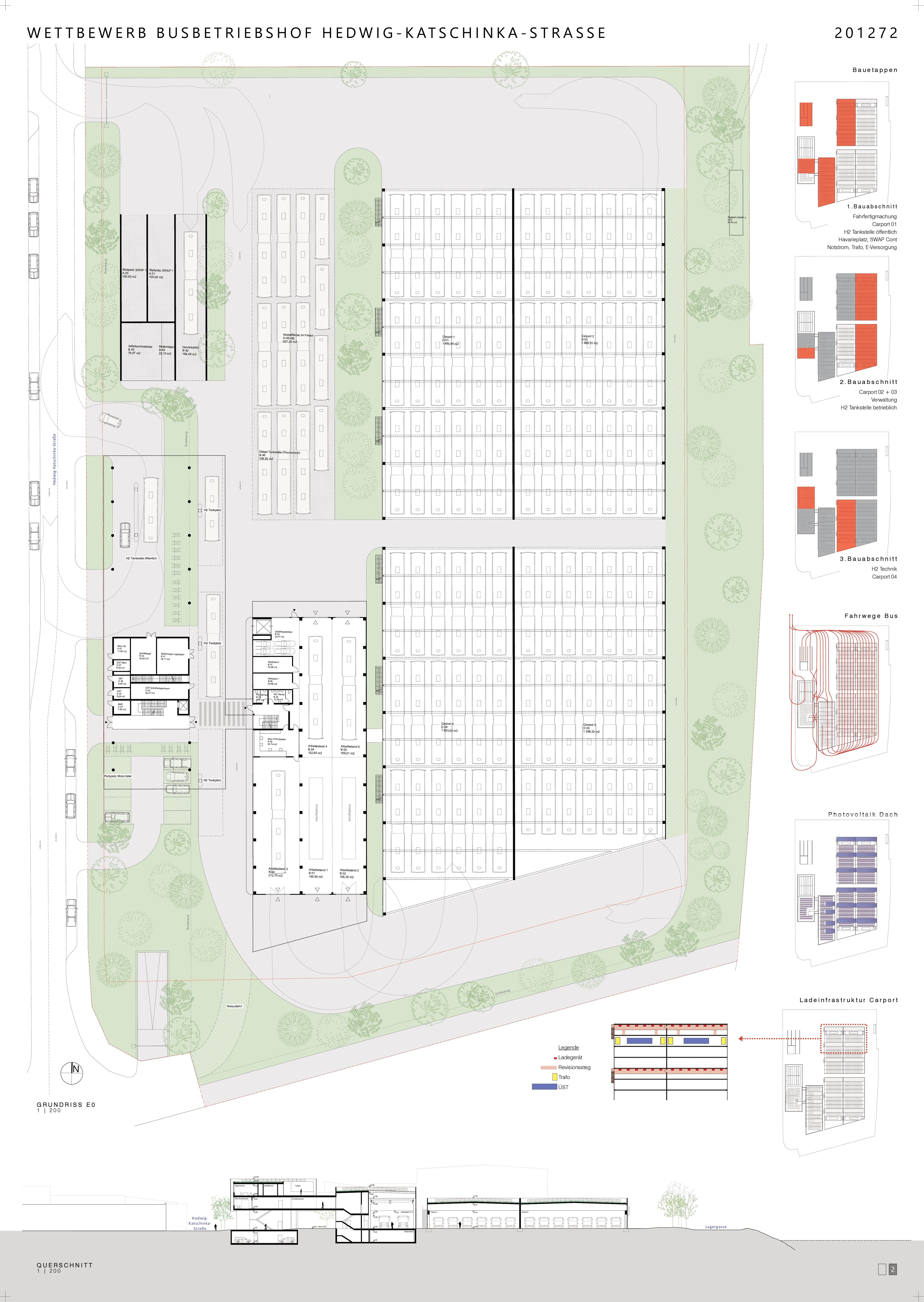 Der Bauplatz ist einerseits determiniert vom Flussraum der aufgestauten Mur, andererseits von gewerblichen, ehemals industriellen Nutzungen. Die Herausforderung besteht in der Anordnung von großflächigen Baukörpern, auch mit der Integration von technischen Anlagen, sowie von Verkehrsflächen. Die wertvollste und nicht vermehrbare Bodenfläche = Erdgeschosszone wird durch konsequentes und weitgehendes Verlagern von Nutzungen, bei denen eine Anordnung darüber – oder darunter – möglich ist, entlastet und somit durchlässig im wahrgenommenen Stadtraum. Insbesondere der an der Hedwig-Katschinka-Straße als einzig möglicher Erschließungsachse angeordnete Freiraum, der als Grünfläche, aber auch Verkehrsraum (H2 Tankstelle) genutzt wird, profitiert zusätzlich von einem klaren, aufgeständerten Baukörper, der sowohl technische Nutzungen, als auch die Verwaltung aufnimmt, aber auch die erforderliche Überdachung von Betriebsfunktionen bietet. Die Setzung von Grünflächen auch innerhalb des Areals mit einer Durchgrünung in Form hochstämmiger Baumpflanzungen, Bepflanzung von Fassaden und weitestgehender Entsiegelung von Flächen lässt eine für derartige Nutzungen optimale, klimaangepasste Umgebung erwarten.