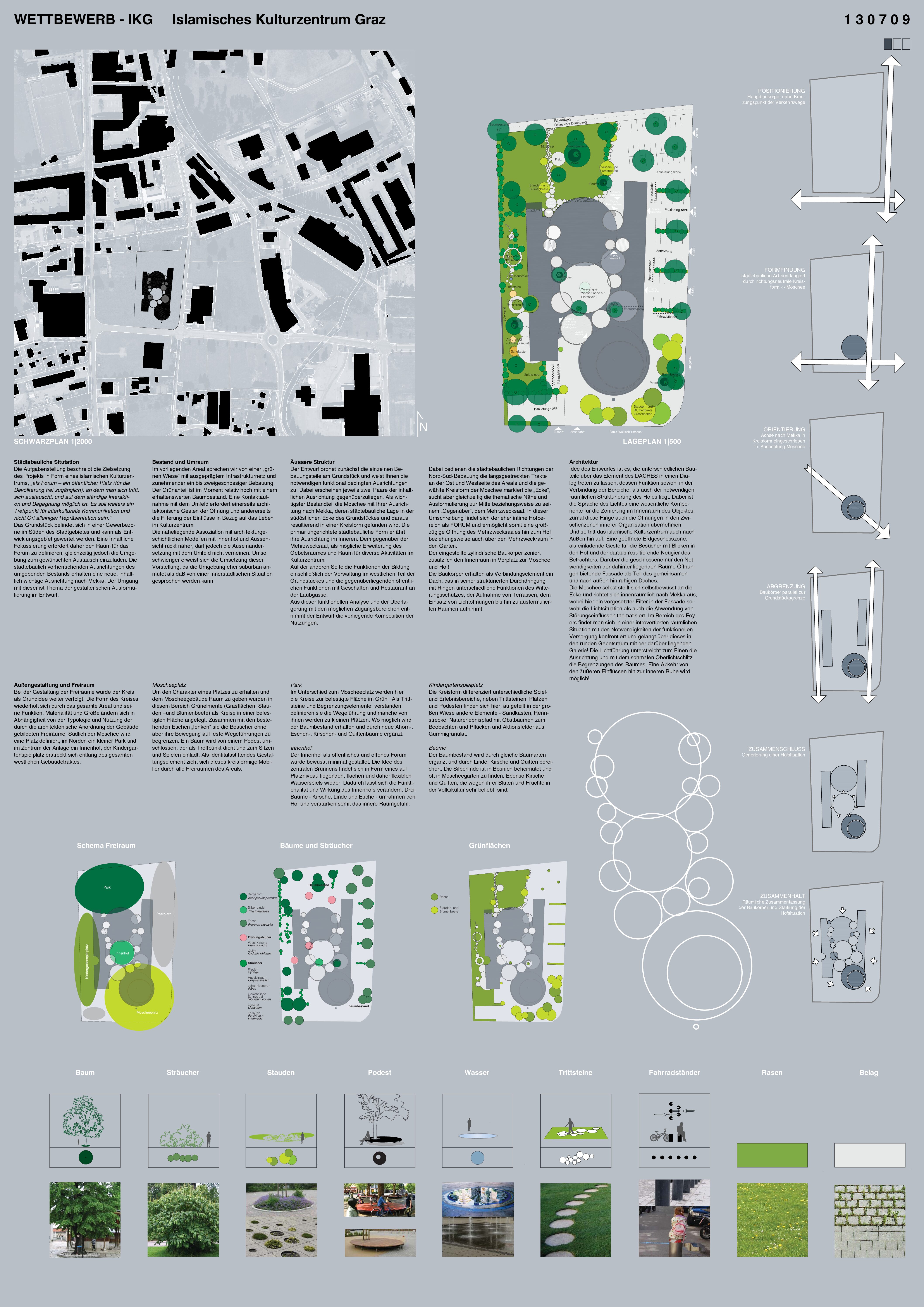 Das Grundstück befindet sich in einer Gewerbezone im Süden des Stadtgebietes und kann als Entwicklungsgebiet gewertet werden. Eine inhaltliche Fokussierung erfordert daher den Raum für das Forum zu definieren, gleichzeitig jedoch die Umgebung zum gewünschten Austausch einzuladen. Die städtebaulich vorherrschenden Ausrichtungen des umgebenden Bestands erhalten eine neue, inhaltlich wichtige Ausrichtung nach Mekka. Der Umgang mit dieser ist Thema der gestalterischen Ausformulierung im Entwurf. Im vorliegenden Areal sprechen wir von einer „grünen Wiese“ mit ausgeprägtem Infrastrukturnetz und zunehmender ein bis zweigeschossiger Bebauung. Der Grünanteil ist im Moment relativ hoch mit einem erhaltenswerten Baumbestand. Eine Kontaktaufnahme mit dem Umfeld erfordert einerseits architektonische Gesten der Öffnung und andererseits die Filterung der Einflüsse in Bezug auf das Leben im Kulturzentrum.
