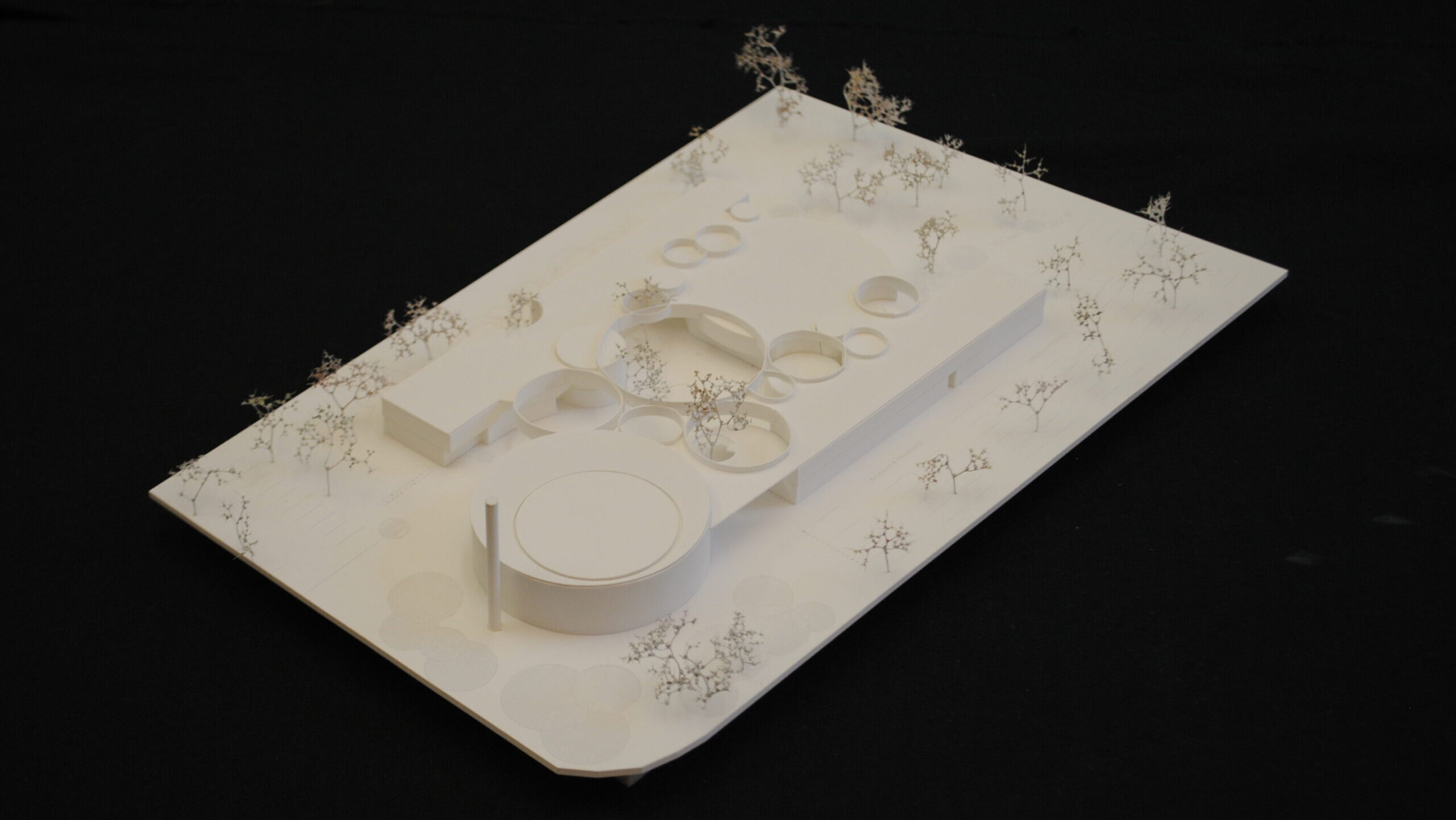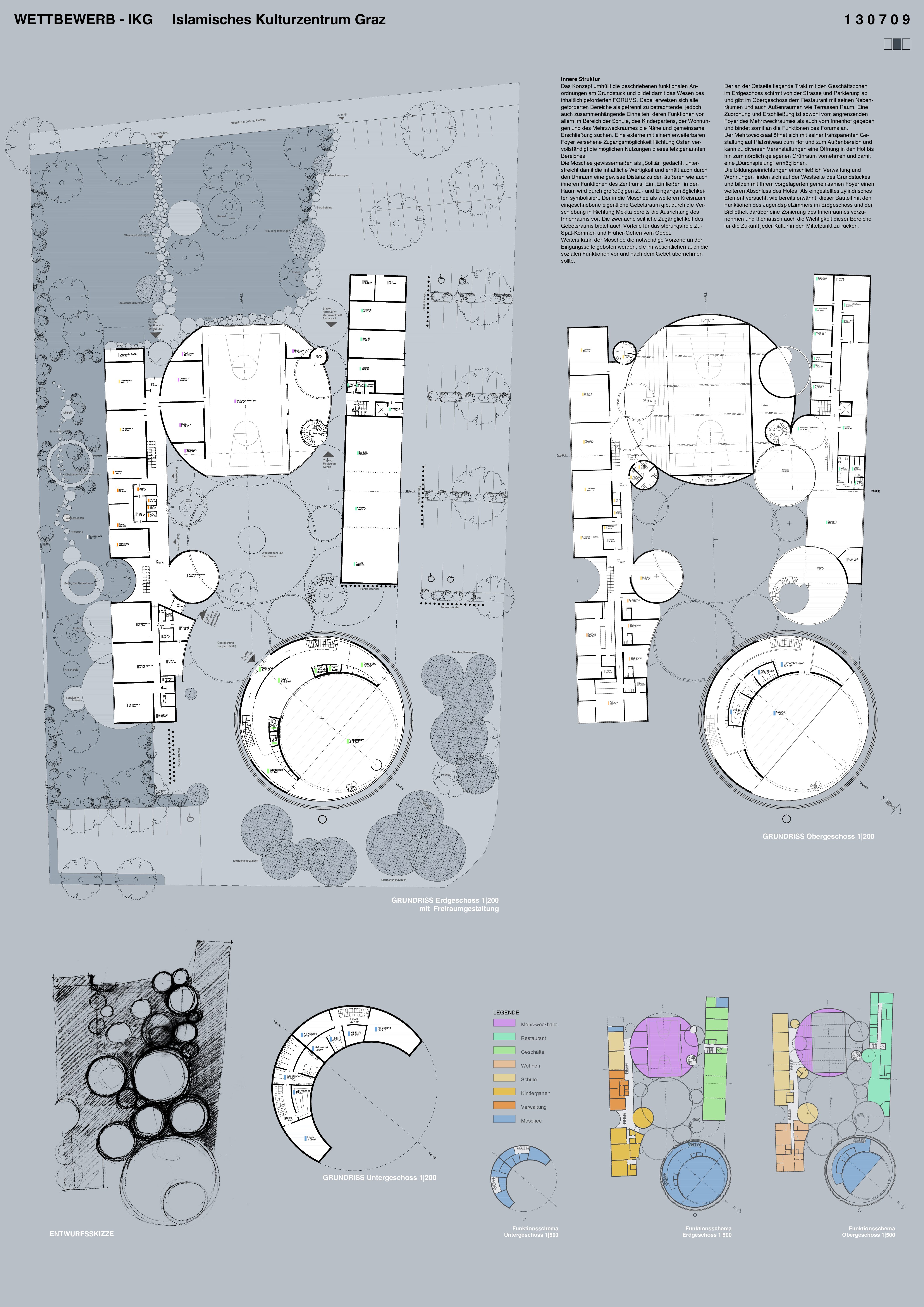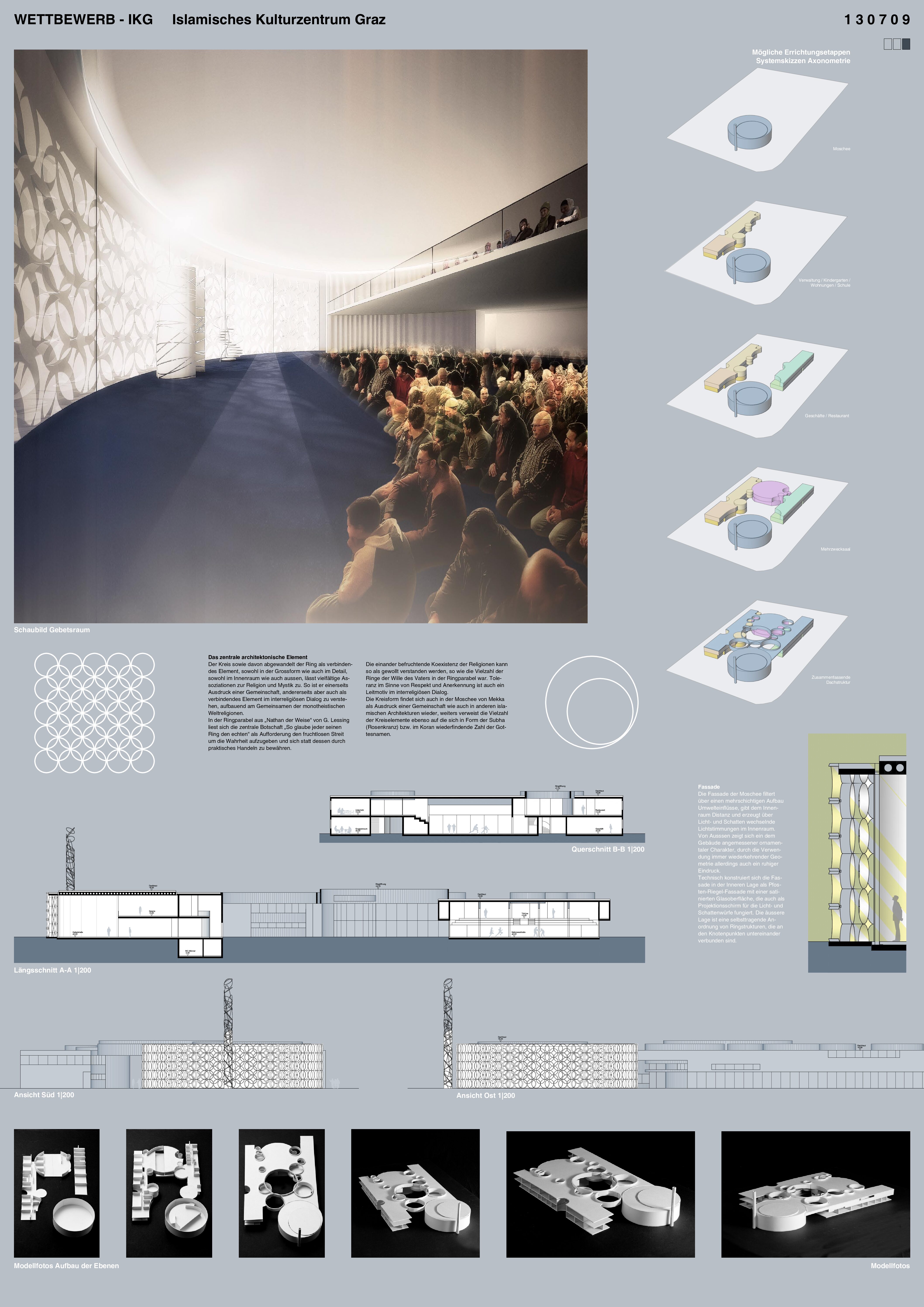Idee des Entwurfes ist es, die unterschiedlichen Bauteile über das Element des DACHES in einen Dialog treten zu lassen, dessen Funktion sowohl in der Verbindung der Bereiche, als auch der notwendigen räumlichen Strukturierung des Hofes liegt. Dabei ist die Sprache des Lichtes eine wesentliche Komponente für die Zonierung im Innenraum des Objektes, zumal diese Ringe auch die Öffnungen in den Zwischenzonen innerer Organisation übernehmen. Und so tritt das islamische Kulturzentrum auch nach Außen hin auf. Eine geöffnete Erdgeschosszone, als einladende Geste für die Besucher mit Blicken in den Hof und der daraus resultierende Neugier des Betrachters. Darüber die geschlossene nur den Notwendigkeiten der dahinter liegenden Räume Öffnungen bietende Fassade als Teil des gemeinsamen und nach außen hin ruhigen Daches. Die Moschee selbst stellt sich selbstbewusst an die Ecke und richtet sich innenräumlich nach Mekka aus, wobei hier ein vorgesetzter Filter in der Fassade sowohl die Lichtsituation als auch die Abwendung von Störungseinflüssen thematisiert. Im Bereich des Foyers findet man sich in einer introvertierten räumlichen Situation mit den Notwendigkeiten der funktionellen Versorgung konfrontiert und gelangt über dieses in den runden Gebetsraum mit der darüber liegenden Galerie. Die Lichtführung unterstreicht zum Einen die Ausrichtung und mit dem schmalen Oberlichtschlitz die Begrenzungen des Raumes. Eine Abkehr von den äußeren Einflüssen hin zur inneren Ruhe wird möglich
