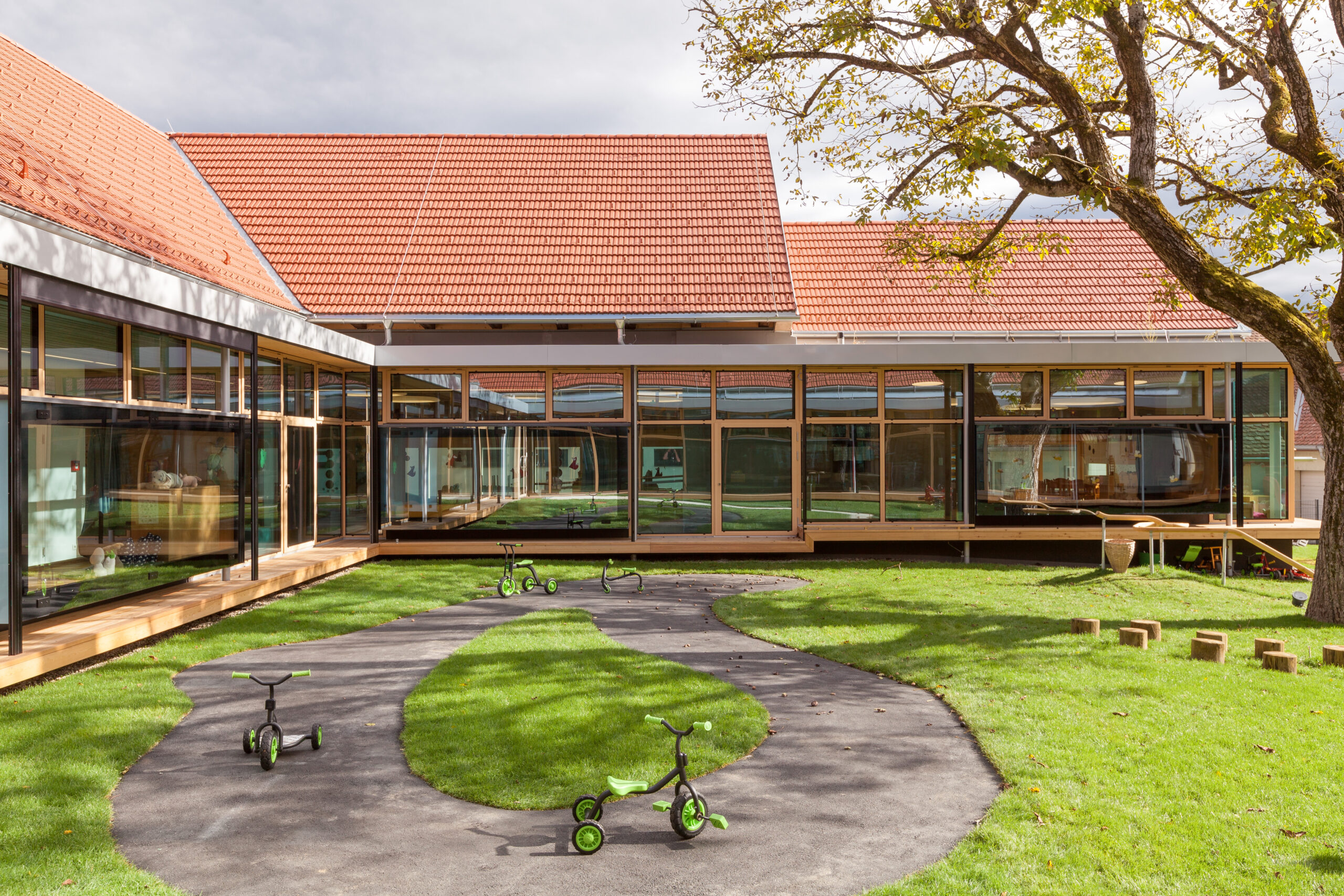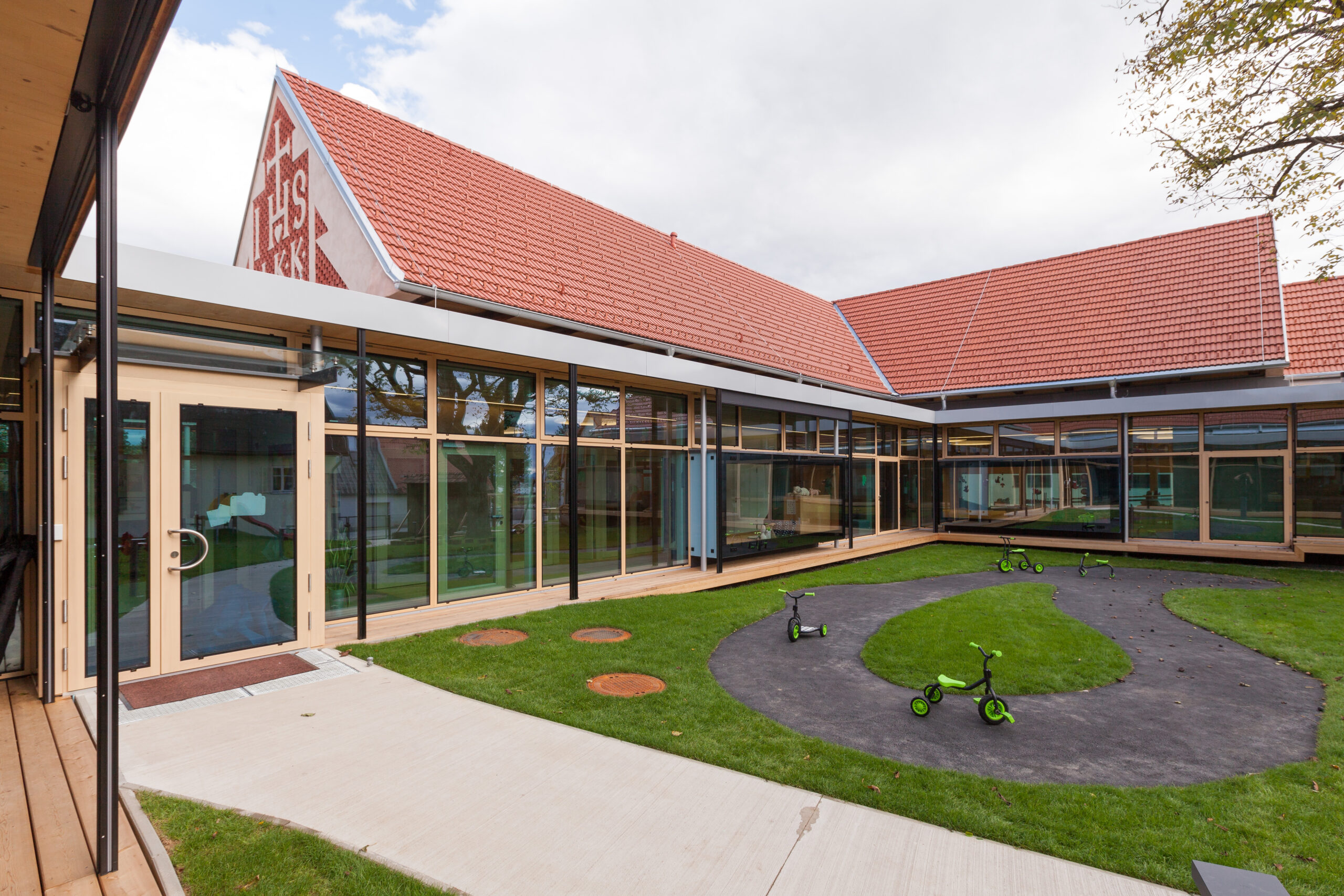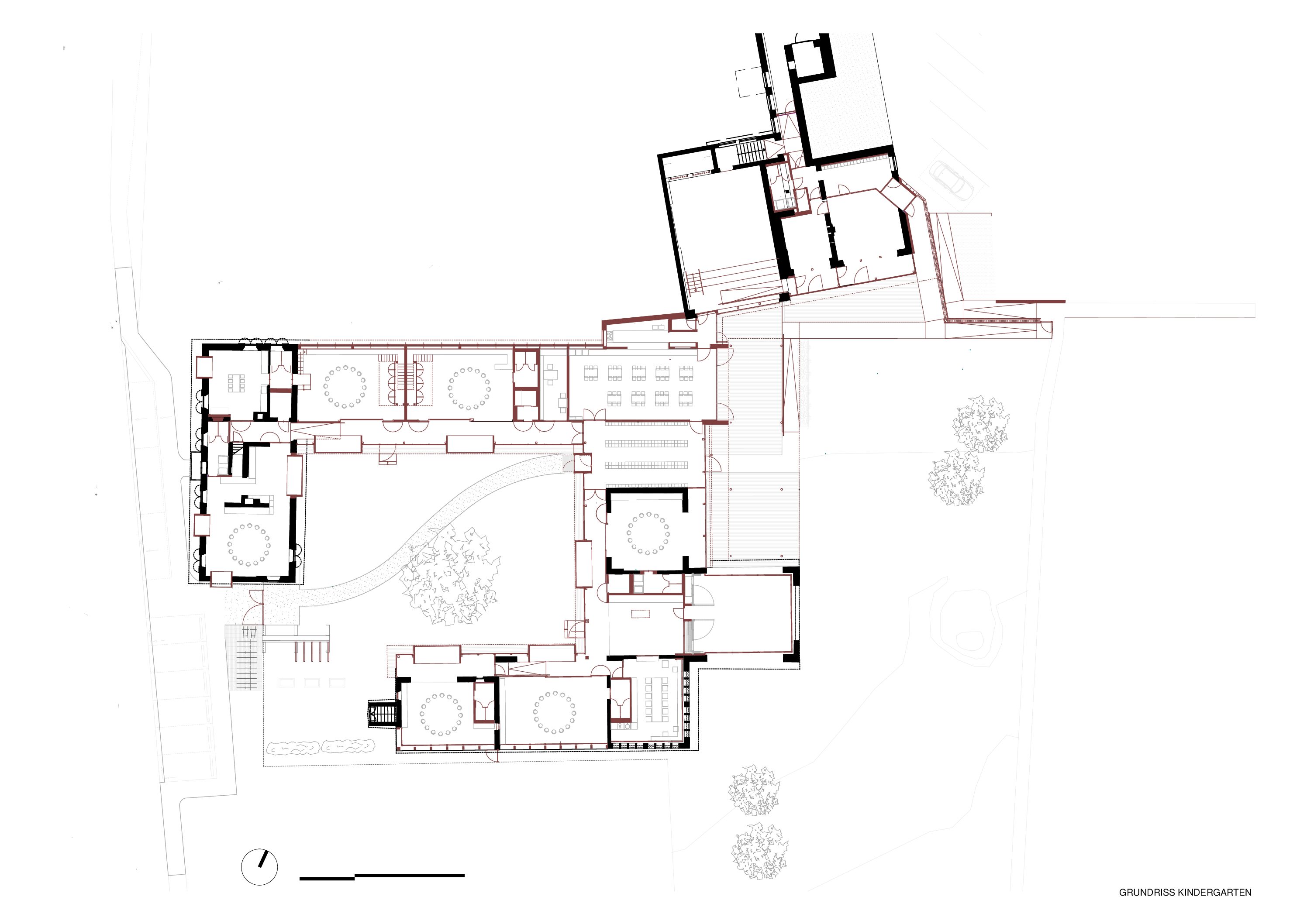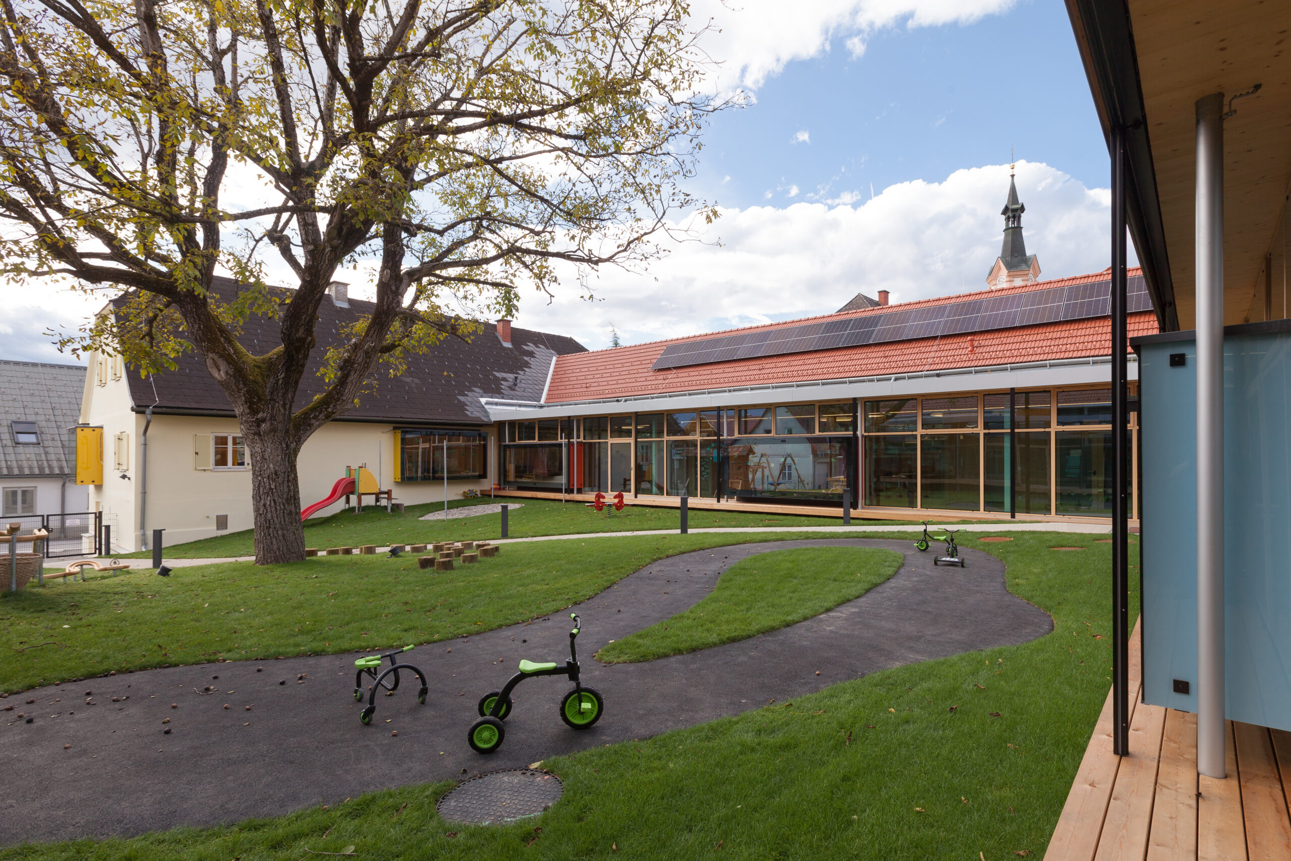 Die Genese dieses Projekts in der Marktgemeinde Hausmannstätten, einer stark wachsenden Umlandgemeinde der Landeshauptstadt Graz, beginnt durch die Notwendigkeit einer Erweiterung des örtlichen Kindergartens, der zuvor auf mehrere Gebäude verteilt war. Das Areal des neuen Kindergartens erstreckt sich von der Dorfstraße im Westen, grenzt im Süden an die freiwillige Feuerwehr und zieht sich weiter in Richtung Wirtschaftshof und der landwirtschaftlich genutzten Flächen der Marktgemeinde im Osten. Im Norden befinden sich der Kirchplatz und die alte Volksschule, deren Untergeschoss weiterhin als Turnsaal genutzt wird. Die Bestandsgebäude bilden bereits eine Hofsituation mit dem bestehenden Baum in der Mitte, wobei die Hofwirkung durch das Schließen in Richtung Osten mit einem Zubau (Haupteingang, Schleuse und Garderobe) noch verstärkt wird. Der nördliche Baukörper (ehemaliges Stallgebäude) wurde aufgrund des schlechten Zustands und aus wirtschaftlichen Gründen in gleicher Lage und Kubatur erneuert und nach Osten verlängert. Im Westen befindet sich das alte Wohnhaus „Hamlitsch“. In einer sorgsamen Transformation des Bestands, der so wie der Stadel eigentlich nicht für die Nutzung eines Kindergartens geeignet schien, ist es gelungen, die unverwechselbare Identität des Ortes mit einem modernen Bildungsbau zu verknüpfen und daraus ein einzigartiges Ensemble zu schaffen. Das Alte, der Bestand, wird immer wieder sichtbar gelassen und erzählt seine fast zweihundertjährige Geschichte. Mit präzisen Eingriffen werden überraschende Ausblicke hergestellt, Bezüge geschaffen und die Spannung in der Nutzung auf immer wieder neue Art und Weise gefördert. Bezug zum Außenraum, zur Spielfläche aber auch zum öffentlichen und halböffentlichen Raum macht die Nutzung für die Kinder zu einem Erlebnis und fügt die einzelnen Gruppen wie Gebäude eines Dorfes zu einem großen Ganzen zusammen. Eine wesentliche Stärke des Projekts ist die umlaufende Anordnung der Kindergartenfunktionen in den Bestandsgebäuden um einen gemeinsamen grünen Hof, in dem ein raumgreifender Baum für eine schattige Atmosphäre und großzügige Verglasungen und sogenannte Sitzfenster für Aufenthaltsqualität zur Beobachtung von Veränderungen der Natur, zugleich aber auch als Bindeglied nach Außen sorgen. Da diesen Innenhof zugleich die fußläufige Erschließung (Bringen und Holen der Kinder) quert, ist auch der kommunikative Charakter dieses Bereichs eine besondere Qualität. Zum Hof orientiert und dem Bestand und somit allen Gruppenräumen vorgeschaltet wird ein überbreiter Erschließungsgang angeordnet, der aber auch den dahinterliegenden Gruppenräumen als erweiterter Spielbereich (z.B. Bobby-Car Rennstrecke) sowie durch die Zonierung mittels Spielefenster auch als kuschelige Relax-Zonen dienen wird. Diese Akzentuierung durch die spielerische Ausformung der Sitzfenster formuliert auch eine wesentliche architektonische Intensivierung. Zugleich sind die Sitzfenster über eine farbliche Gestaltung ablesbare Identifikationspunkte für die einzelnen Gruppen. Die Abtrennung der Erschließungsbereiche von den Gruppenräumen ist transparent und möglichst groß öffenbar, um Gruppenräume und Gangzonen auch bedarfsgerecht koppeln zu können. Ganz bewusst ist der Spielplatz davon getrennt auf der Rückseite des Kindergartens angeordnet und vom Innenhof auch baulich abgeteilt. Diesem Bereich ist auch die Kinderkrippen-Gruppe zugeordnet, die im Norden des Spielplatzes im ehemaligen Untergeschoss der alten Volksschule situiert ist.