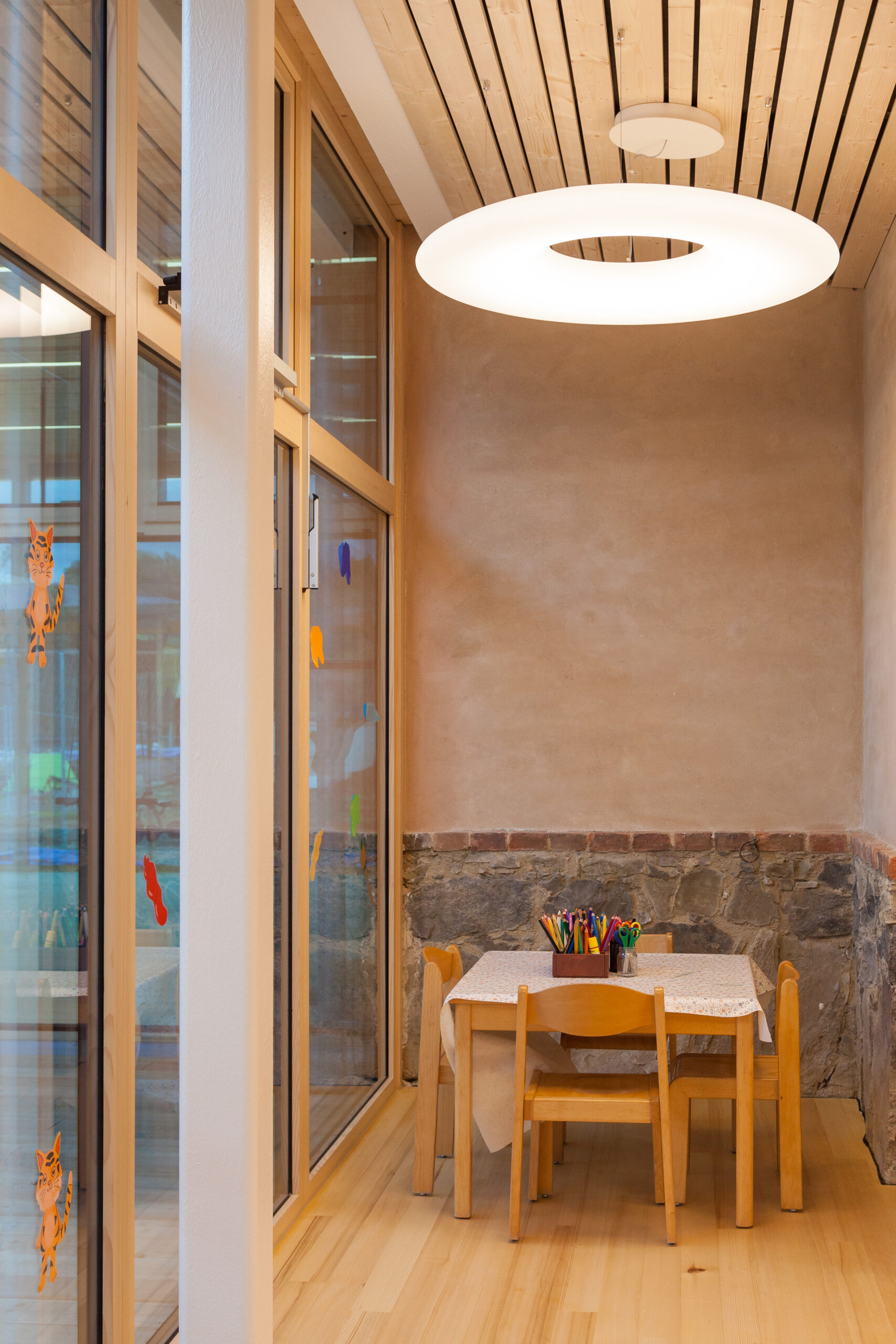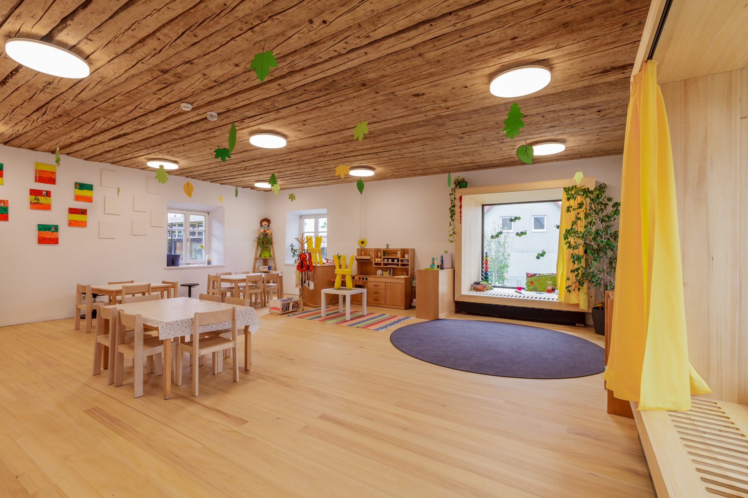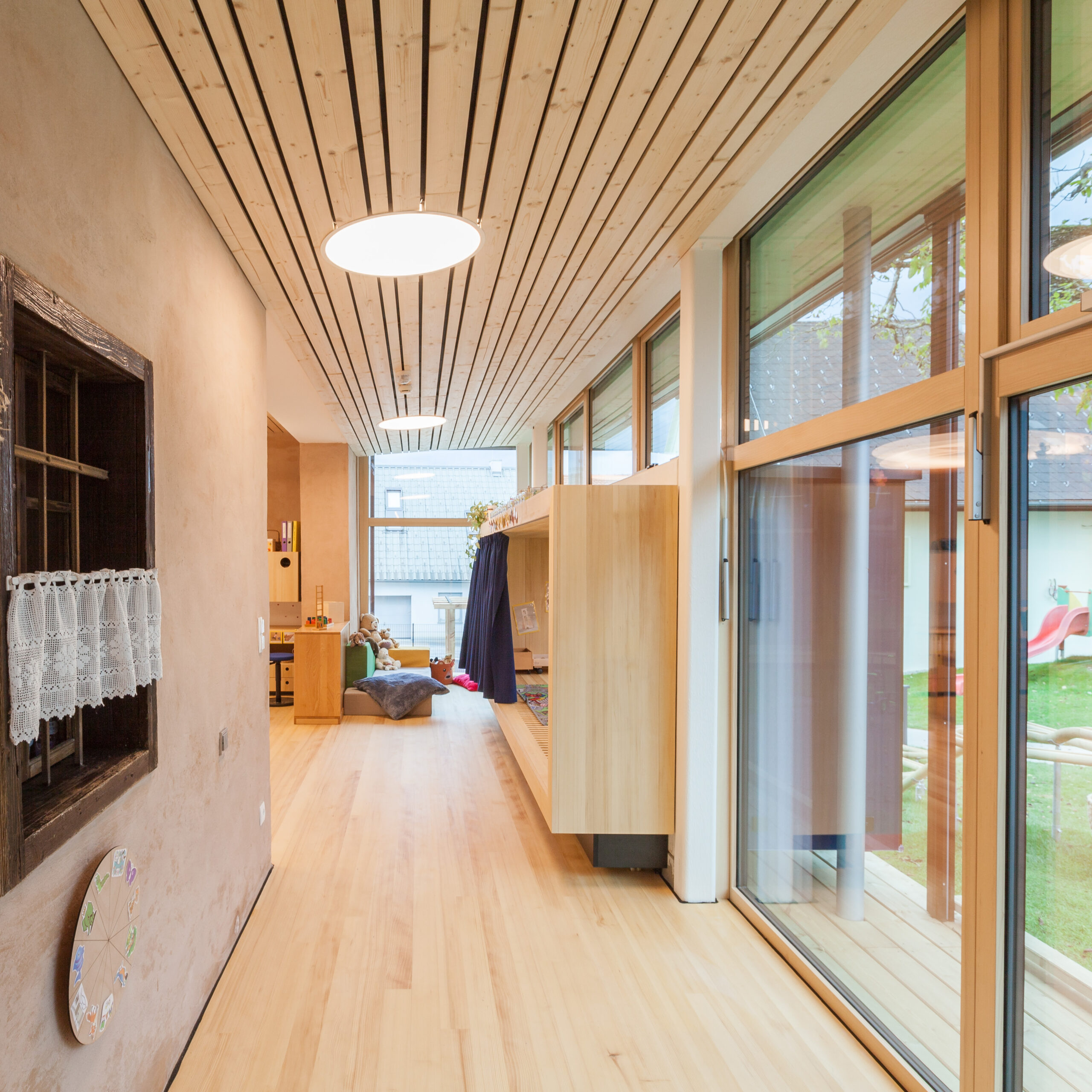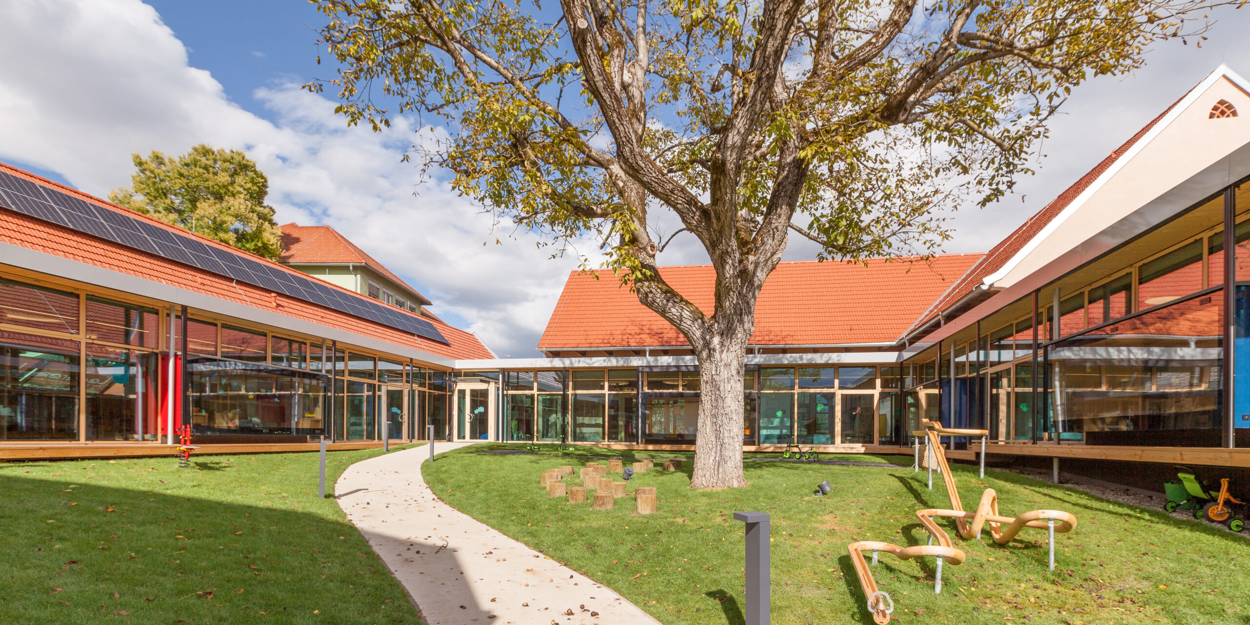 Die Genese dieses Projekts in der Marktgemeinde Hausmannstätten, einer stark wachsenden Umlandgemeinde der Landeshauptstadt Graz, beginnt durch die Notwendigkeit einer Erweiterung des örtlichen Kindergartens, der zuvor auf mehrere Gebäude verteilt war. Das Areal des neuen Kindergartens erstreckt sich von der Dorfstraße im Westen, grenzt im Süden an die freiwillige Feuerwehr und zieht sich weiter in Richtung Wirtschaftshof und der landwirtschaftlich genutzten Flächen der Marktgemeinde im Osten. Im Norden befinden sich der Kirchplatz und die alte Volksschule, deren Untergeschoss weiterhin als Turnsaal genutzt wird. Die Bestandsgebäude bilden bereits eine Hofsituation mit dem bestehenden Baum in der Mitte, wobei die Hofwirkung durch das Schließen in Richtung Osten mit einem Zubau (Haupteingang, Schleuse und Garderobe) noch verstärkt wird. Der nördliche Baukörper (ehemaliges Stallgebäude) wurde aufgrund des schlechten Zustands und aus wirtschaftlichen Gründen in gleicher Lage und Kubatur erneuert und nach Osten verlängert. Im Westen befindet sich das alte Wohnhaus „Hamlitsch“. In einer sorgsamen Transformation des Bestands, der so wie der Stadel eigentlich nicht für die Nutzung eines Kindergartens geeignet schien, ist es gelungen, die unverwechselbare Identität des Ortes mit einem modernen Bildungsbau zu verknüpfen und daraus ein einzigartiges Ensemble zu schaffen. Das Alte, der Bestand, wird immer wieder sichtbar gelassen und erzählt seine fast zweihundertjährige Geschichte. Mit präzisen Eingriffen werden überraschende Ausblicke hergestellt, Bezüge geschaffen und die Spannung in der Nutzung auf immer wieder neue Art und Weise gefördert. Bezug zum Außenraum, zur Spielfläche aber auch zum öffentlichen und halböffentlichen Raum macht die Nutzung für die Kinder zu einem Erlebnis und fügt die einzelnen Gruppen wie Gebäude eines Dorfes zu einem großen Ganzen zusammen. Eine wesentliche Stärke des Projekts ist die umlaufende Anordnung der Kindergartenfunktionen in den Bestandsgebäuden um einen gemeinsamen grünen Hof, in dem ein raumgreifender Baum für eine schattige Atmosphäre und großzügige Verglasungen und sogenannte Sitzfenster für Aufenthaltsqualität zur Beobachtung von Veränderungen der Natur, zugleich aber auch als Bindeglied nach Außen sorgen. Da diesen Innenhof zugleich die fußläufige Erschließung (Bringen und Holen der Kinder) quert, ist auch der kommunikative Charakter dieses Bereichs eine besondere Qualität. Zum Hof orientiert und dem Bestand und somit allen Gruppenräumen vorgeschaltet wird ein überbreiter Erschließungsgang angeordnet, der aber auch den dahinterliegenden Gruppenräumen als erweiterter Spielbereich (z.B. Bobby-Car Rennstrecke) sowie durch die Zonierung mittels Spielefenster auch als kuschelige Relax-Zonen dienen wird. Diese Akzentuierung durch die spielerische Ausformung der Sitzfenster formuliert auch eine wesentliche architektonische Intensivierung. Zugleich sind die Sitzfenster über eine farbliche Gestaltung ablesbare Identifikationspunkte für die einzelnen Gruppen. Die Abtrennung der Erschließungsbereiche von den Gruppenräumen ist transparent und möglichst groß öffenbar, um Gruppenräume und Gangzonen auch bedarfsgerecht koppeln zu können. Ganz bewusst ist der Spielplatz davon getrennt auf der Rückseite des Kindergartens angeordnet und vom Innenhof auch baulich abgeteilt. Diesem Bereich ist auch die Kinderkrippen-Gruppe zugeordnet, die im Norden des Spielplatzes im ehemaligen Untergeschoss der alten Volksschule situiert ist.