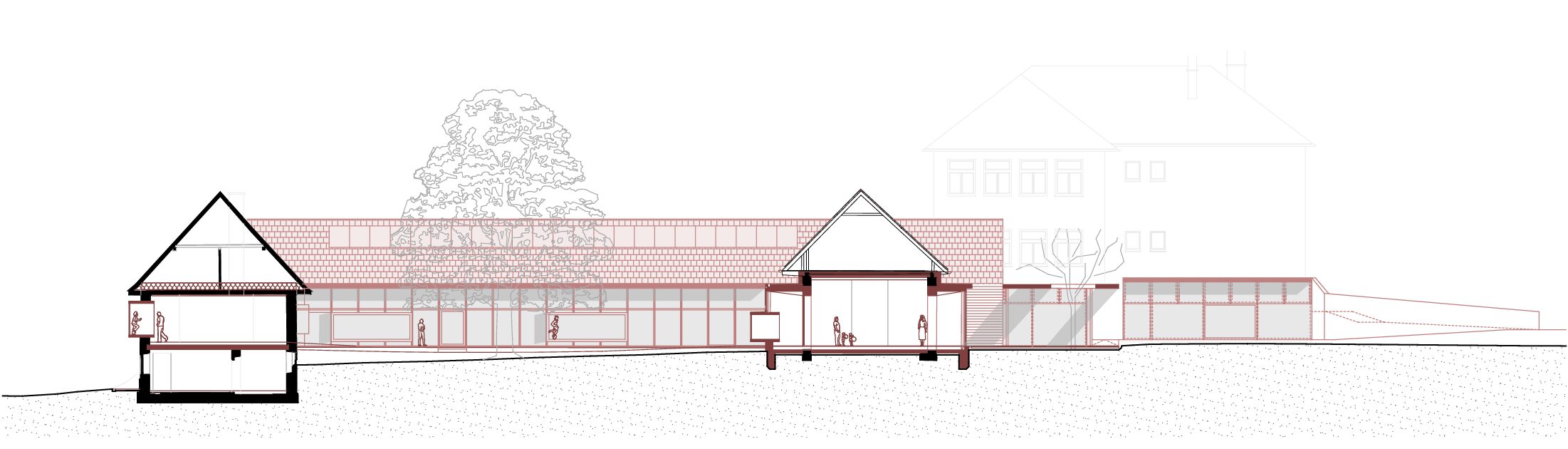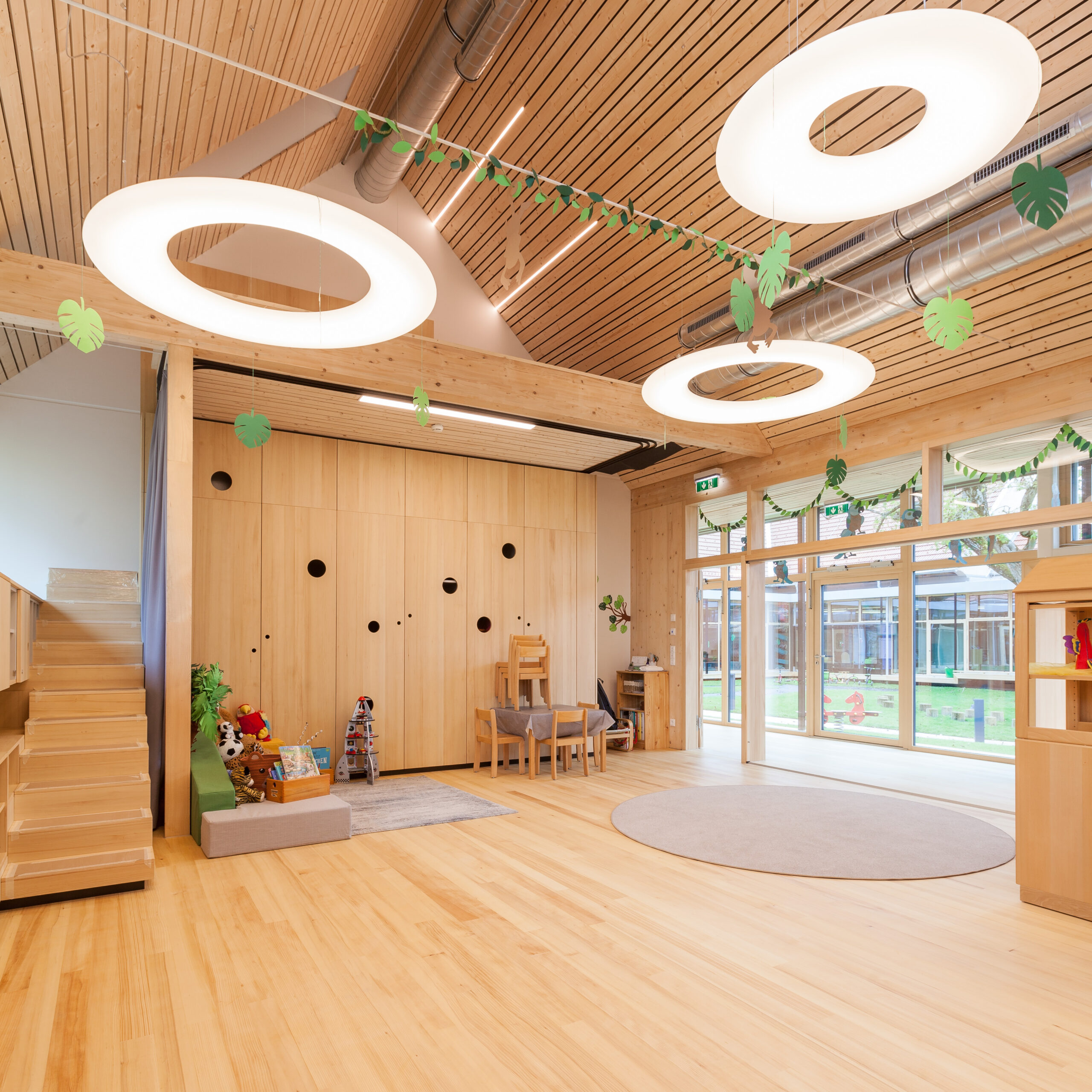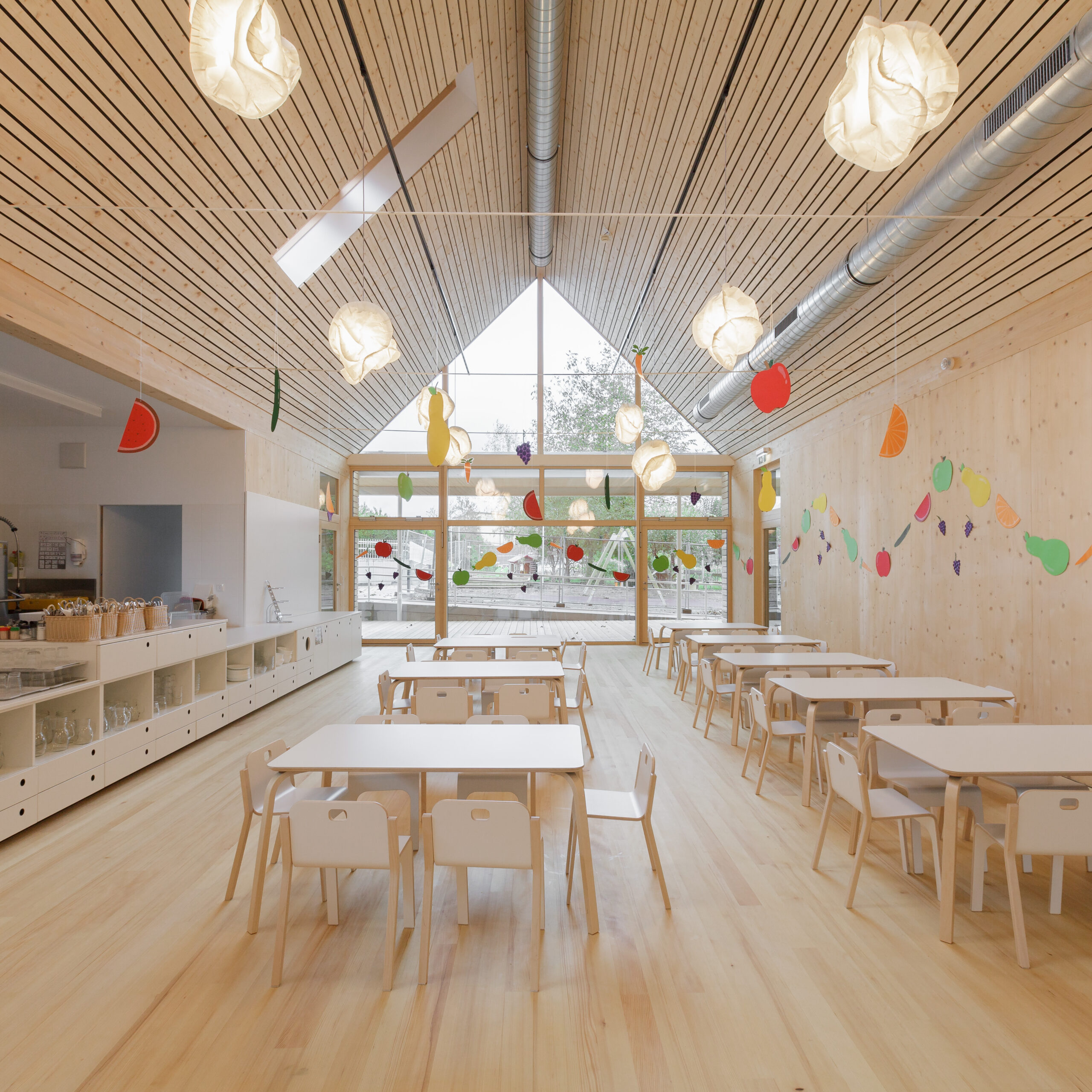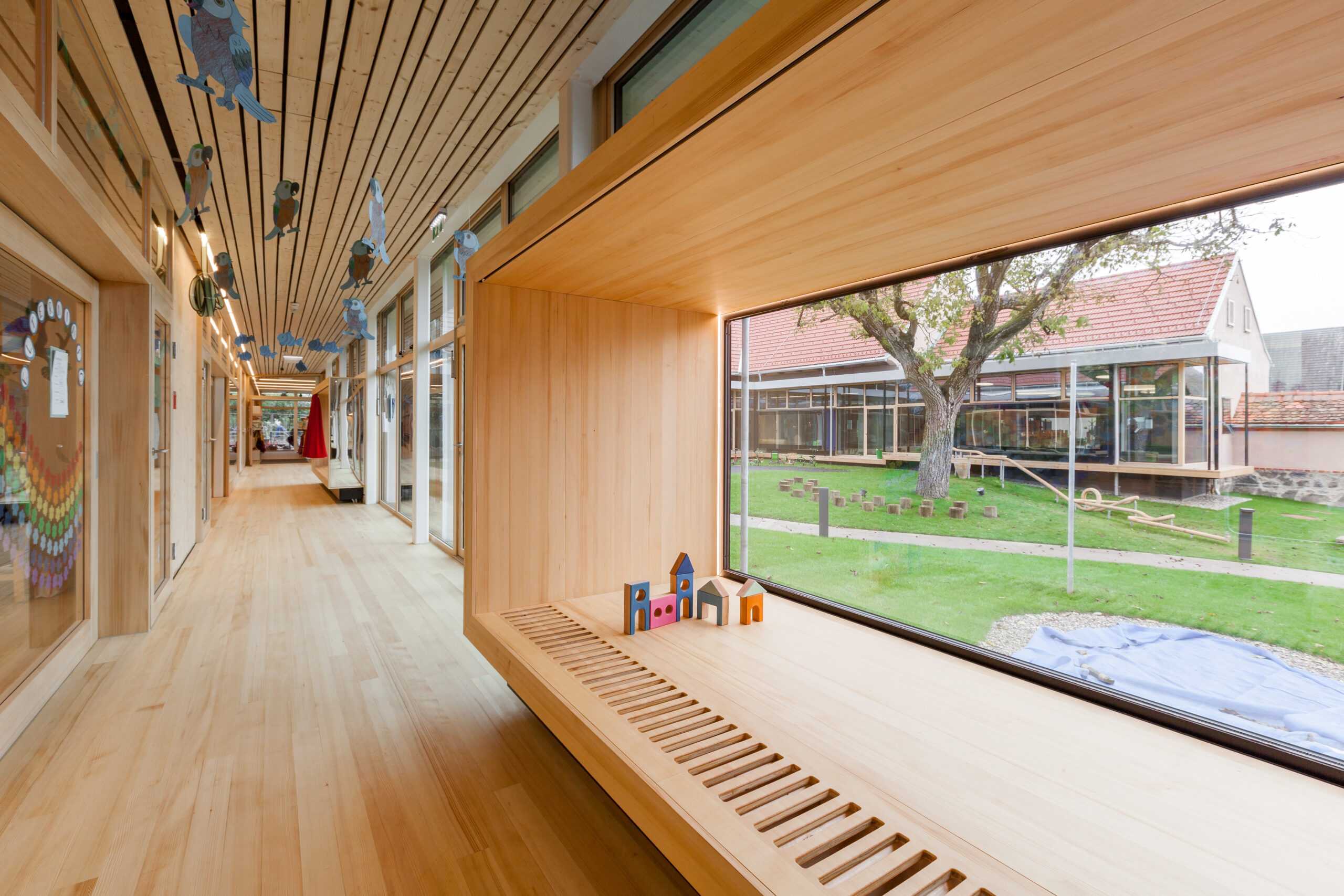 Die Genese dieses Projekts in der Marktgemeinde Hausmannstätten, einer stark wachsenden Umlandgemeinde der Landeshauptstadt Graz, beginnt durch die Notwendigkeit einer Erweiterung des örtlichen Kindergartens, der zuvor auf mehrere Gebäude verteilt war. Das Areal des neuen Kindergartens erstreckt sich von der Dorfstraße im Westen, grenzt im Süden an die freiwillige Feuerwehr und zieht sich weiter in Richtung Wirtschaftshof und der landwirtschaftlich genutzten Flächen der Marktgemeinde im Osten. Im Norden befinden sich der Kirchplatz und die alte Volksschule, deren Untergeschoss weiterhin als Turnsaal genutzt wird. Die Bestandsgebäude bilden bereits eine Hofsituation mit dem bestehenden Baum in der Mitte, wobei die Hofwirkung durch das Schließen in Richtung Osten mit einem Zubau (Haupteingang, Schleuse und Garderobe) noch verstärkt wird. Der nördliche Baukörper (ehemaliges Stallgebäude) wurde aufgrund des schlechten Zustands und aus wirtschaftlichen Gründen in gleicher Lage und Kubatur erneuert und nach Osten verlängert. Im Westen befindet sich das alte Wohnhaus „Hamlitsch“. In einer sorgsamen Transformation des Bestands, der so wie der Stadel eigentlich nicht für die Nutzung eines Kindergartens geeignet schien, ist es gelungen, die unverwechselbare Identität des Ortes mit einem modernen Bildungsbau zu verknüpfen und daraus ein einzigartiges Ensemble zu schaffen. Das Alte, der Bestand, wird immer wieder sichtbar gelassen und erzählt seine fast zweihundertjährige Geschichte. Mit präzisen Eingriffen werden überraschende Ausblicke hergestellt, Bezüge geschaffen und die Spannung in der Nutzung auf immer wieder neue Art und Weise gefördert. Bezug zum Außenraum, zur Spielfläche aber auch zum öffentlichen und halböffentlichen Raum macht die Nutzung für die Kinder zu einem Erlebnis und fügt die einzelnen Gruppen wie Gebäude eines Dorfes zu einem großen Ganzen zusammen. Eine wesentliche Stärke des Projekts ist die umlaufende Anordnung der Kindergartenfunktionen in den Bestandsgebäuden um einen gemeinsamen grünen Hof, in dem ein raumgreifender Baum für eine schattige Atmosphäre und großzügige Verglasungen und sogenannte Sitzfenster für Aufenthaltsqualität zur Beobachtung von Veränderungen der Natur, zugleich aber auch als Bindeglied nach Außen sorgen. Da diesen Innenhof zugleich die fußläufige Erschließung (Bringen und Holen der Kinder) quert, ist auch der kommunikative Charakter dieses Bereichs eine besondere Qualität. Zum Hof orientiert und dem Bestand und somit allen Gruppenräumen vorgeschaltet wird ein überbreiter Erschließungsgang angeordnet, der aber auch den dahinterliegenden Gruppenräumen als erweiterter Spielbereich (z.B. Bobby-Car Rennstrecke) sowie durch die Zonierung mittels Spielefenster auch als kuschelige Relax-Zonen dienen wird. Diese Akzentuierung durch die spielerische Ausformung der Sitzfenster formuliert auch eine wesentliche architektonische Intensivierung. Zugleich sind die Sitzfenster über eine farbliche Gestaltung ablesbare Identifikationspunkte für die einzelnen Gruppen. Die Abtrennung der Erschließungsbereiche von den Gruppenräumen ist transparent und möglichst groß öffenbar, um Gruppenräume und Gangzonen auch bedarfsgerecht koppeln zu können. Ganz bewusst ist der Spielplatz davon getrennt auf der Rückseite des Kindergartens angeordnet und vom Innenhof auch baulich abgeteilt. Diesem Bereich ist auch die Kinderkrippen-Gruppe zugeordnet, die im Norden des Spielplatzes im ehemaligen Untergeschoss der alten Volksschule situiert ist.