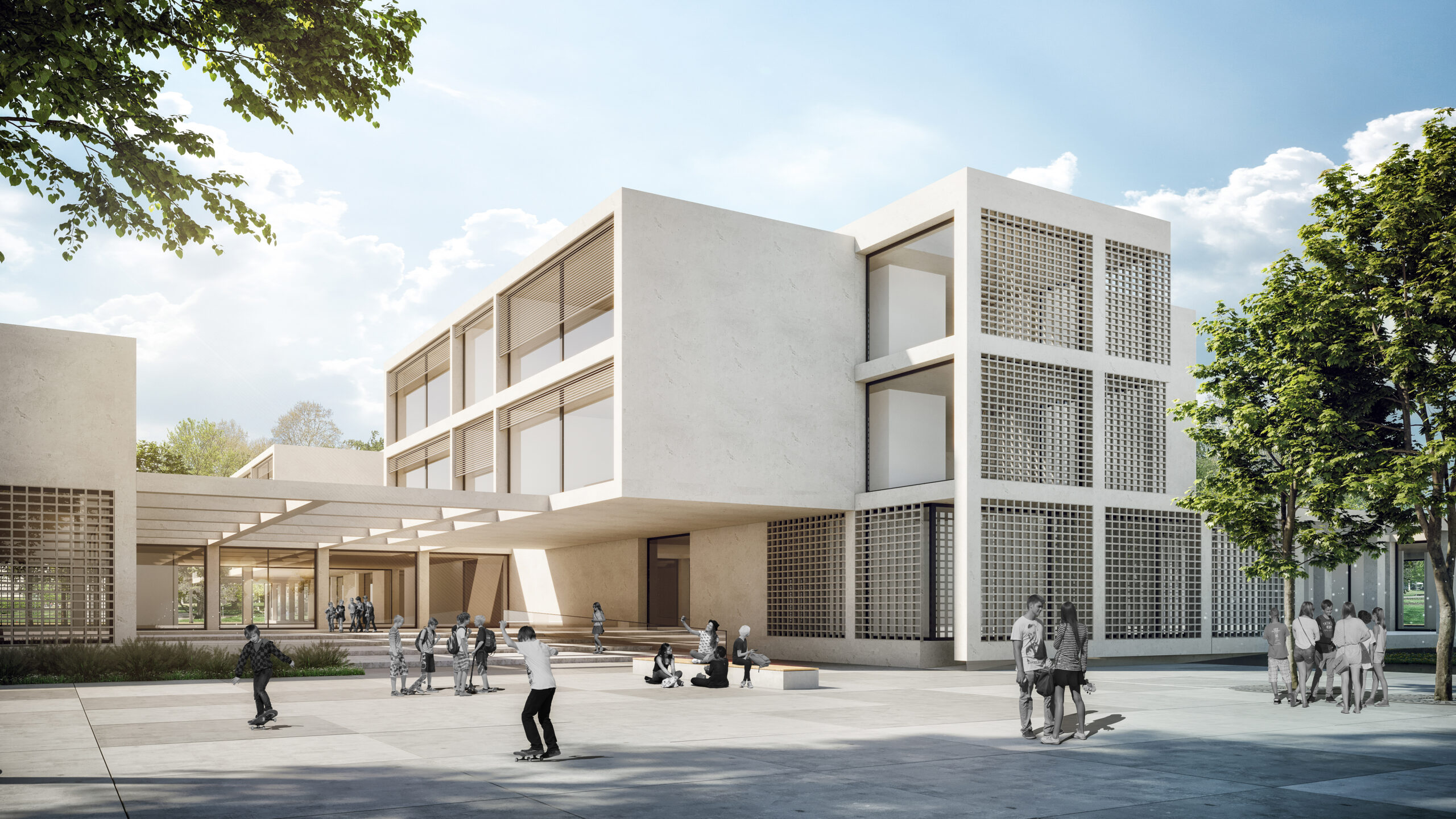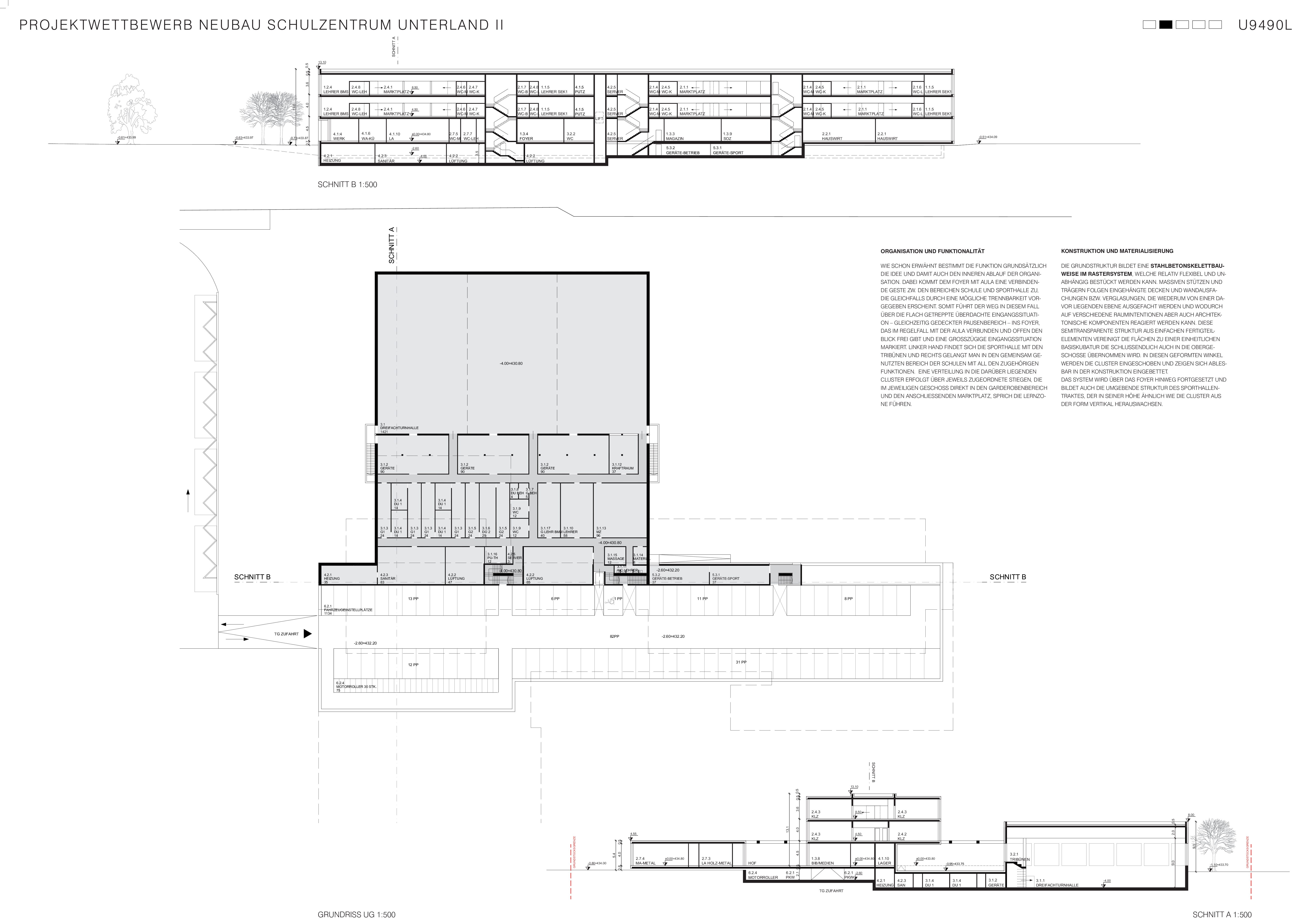 Die Grundstruktur bildet eine Stahlbetonskelettbauweise im Rastersystem, welche relativ flexibel und unabhängig bestückt werden kann. Massiven Stützen und Trägern folgen eingehängte Decken und Wandausfachungen bzw. Verglasungen, die wiederum von einer davor liegenden Ebene ausgefacht werden und wodurch auf verschiedene Raumintentionen, aber auch architektonische Komponenten reagiert werden kann. Diese semitransparente Struktur aus einfachen Fertigteil-Elementen vereinigt die Flächen zu einer einheitlichen Basiskubatur, die schlussendlich auch in die Obergeschosse übernommen wird. In diesen geformten Winkel werden die Cluster eingeschoben und zeigen sich ablesbar in der Konstruktion eingebettet. Das System wird über das Foyer hinweg fortgesetzt und bildet auch die umgebende Struktur des Sporthallentraktes, der in seiner Höhe ähnlich wie die Cluster aus der Form vertikal herauswächst. Wegen der eingeschossigen Fläche erweist sich die Struktur als eher flach gehalten und nimmt nur im Bereich der Cluster und der Sporthalle punktuelle Erhöhungen vor, die – wie schon gesagt – Referenz an die kleingliedrige Umgebung erweisen. Das Stahlbetonskelett kann aufgrund der geringen Spannweiten wirtschaftlichst ausgeführt werden und kann die Lasten möglichst gut verteilt auf den Baugrund ableiten. Die offene Parkierung im Untergeschoss ist als Einsenkung im Boden etwa bis auf die tragende Schicht gedacht und in ihrer offenen Form ohne mechanische Belüftung ausführbar. Gleichzeitig wird dadurch hochwertiger Baugrund von parkenden PKWs freigehalten und nutzbar gemacht.