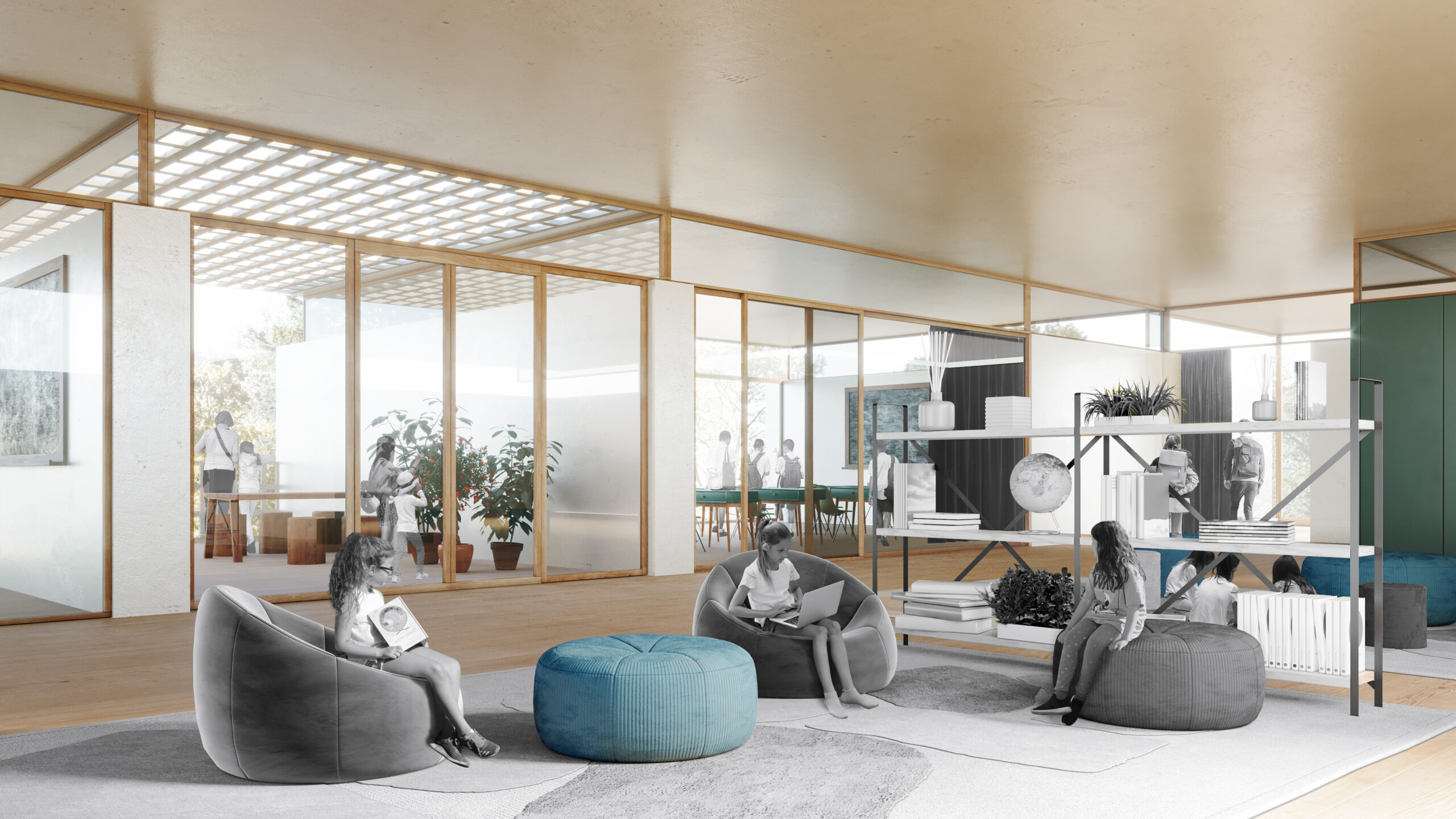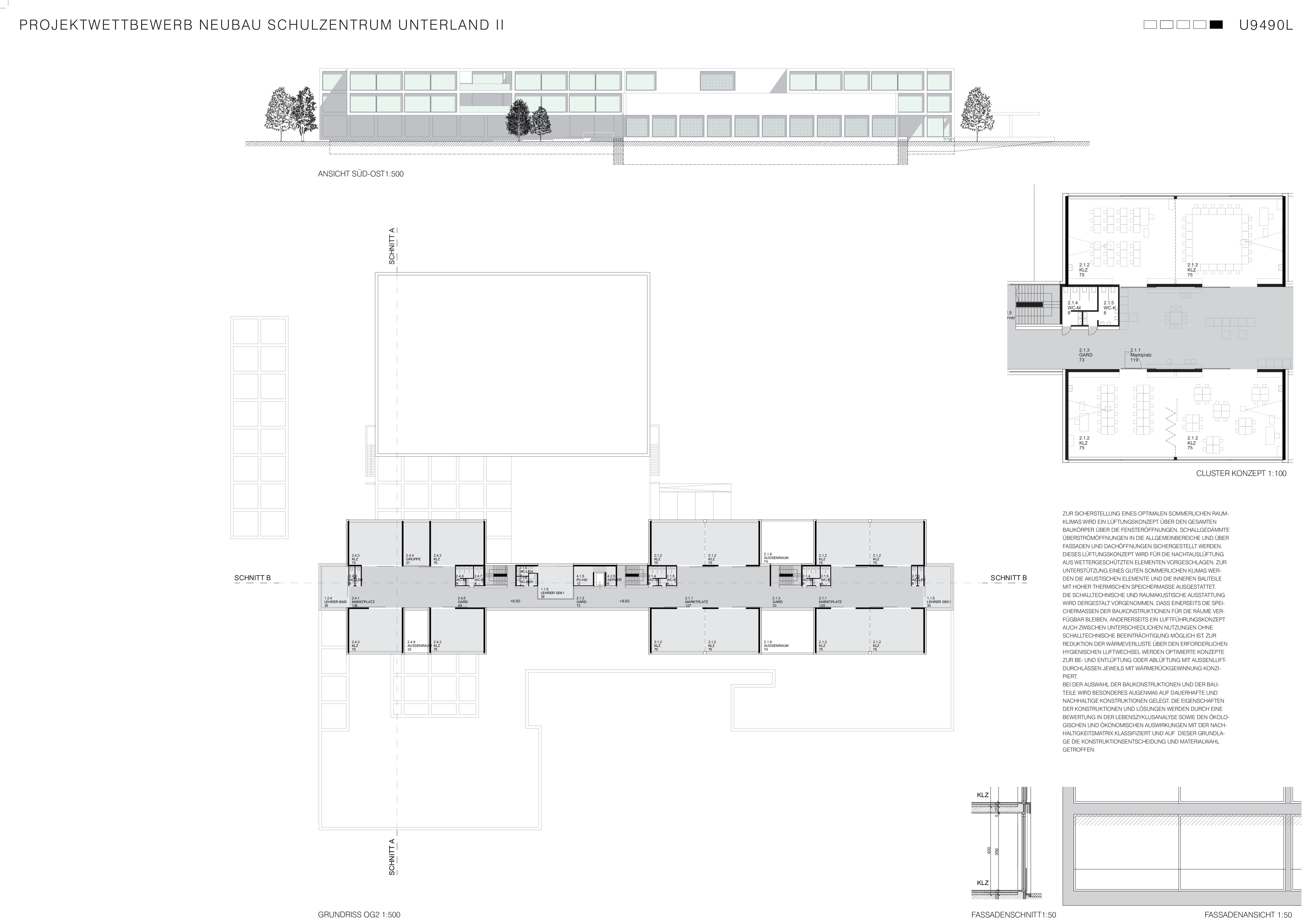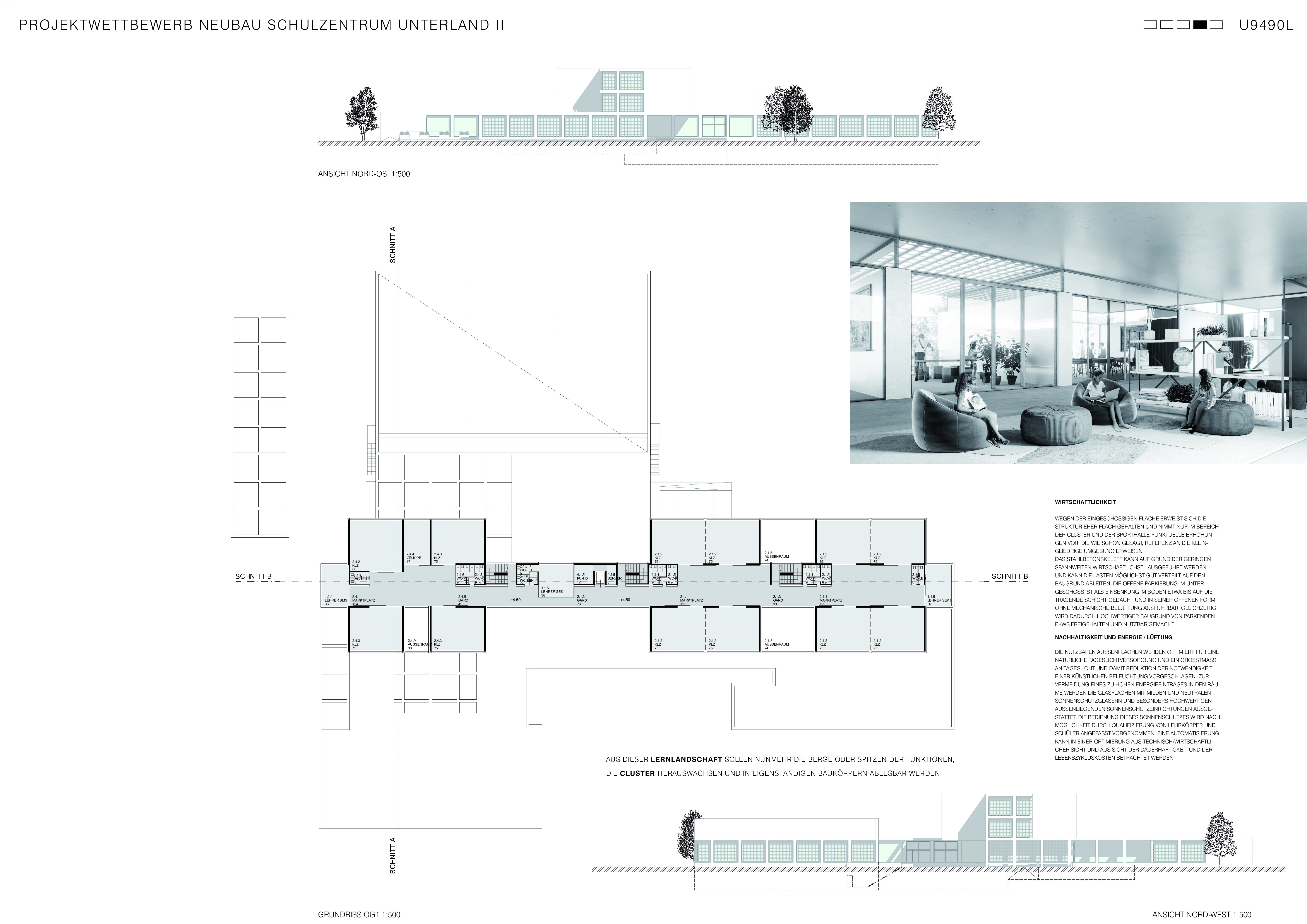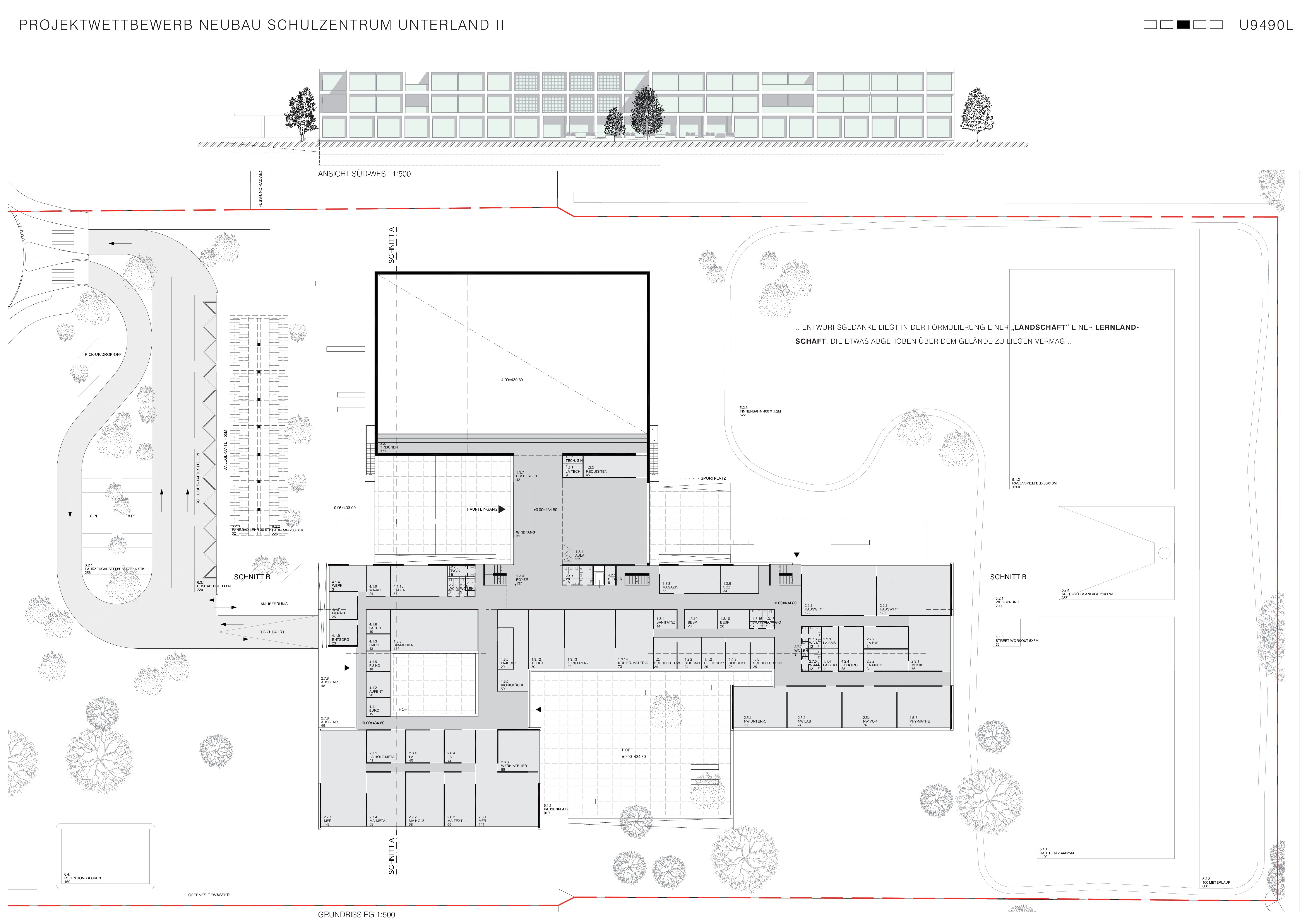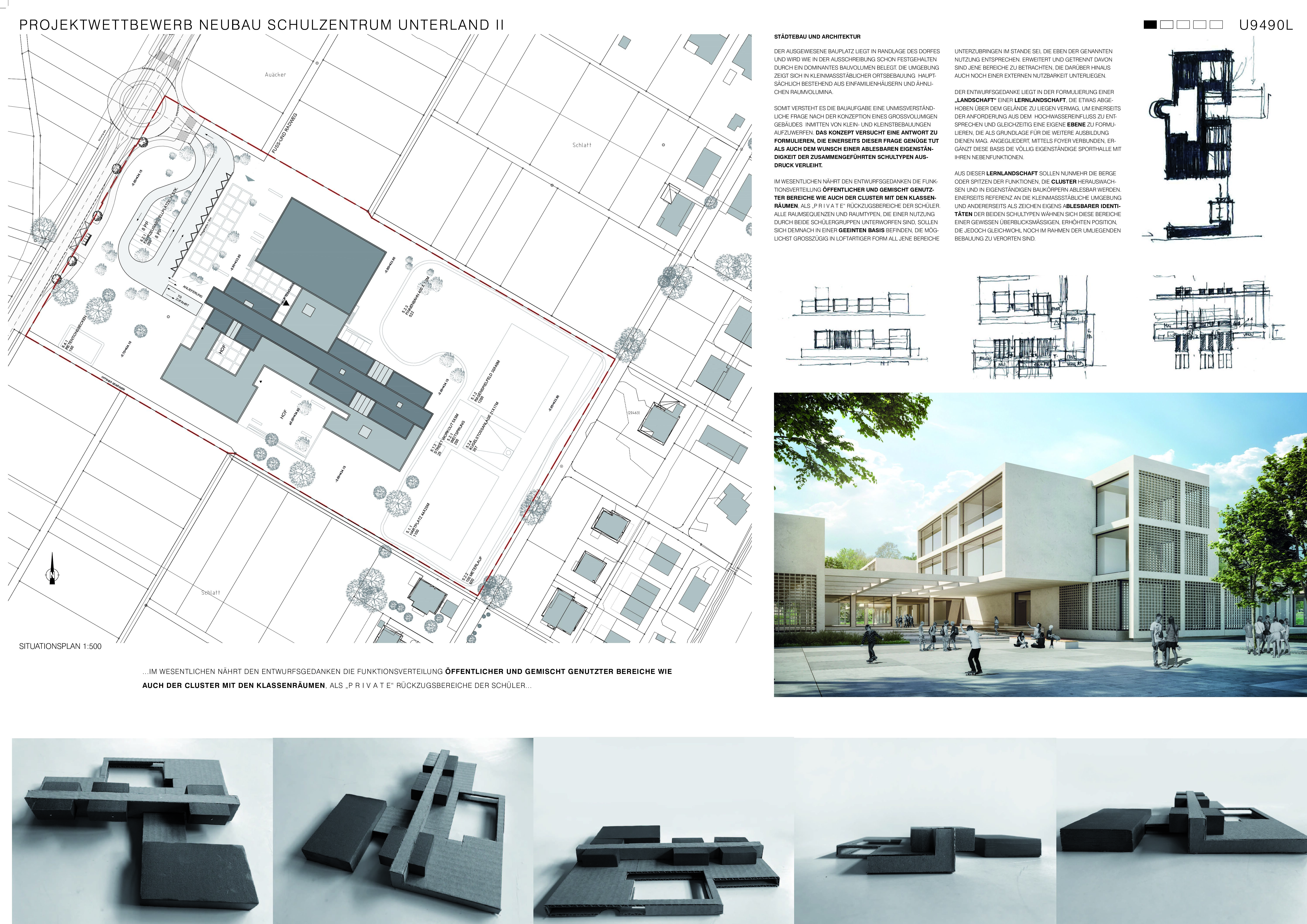 Der ausgewiesene Bauplatz liegt in Randlage des Dorfes und wird, wie in der Ausschreibung schon festgehalten, durch ein dominantes Bauvolumen belegt. Die Umgebung zeigt sich in kleinmaßstäblicher Ortsbebauung, hauptsächlich bestehend aus Einfamilienhäusern und ähnlichen Raumvolumina. Somit versteht es die Bauaufgabe, eine unmissverständliche Frage nach der Konzeption eines großvolumigen Gebäudes inmitten von Klein- und Kleinstbebauungen aufzuwerfen. Das Konzept versucht, eine Antwort zu formulieren, die einerseits dieser Frage Genüge tut als auch dem Wunsch einer ablesbaren Eigenständigkeit der zusammengeführten Schultypen Ausdruck verleiht. Im Wesentlichen nährt den Entwurfsgedanken die Funktionsverteilung öffentlicher und gemischt genutzter Bereiche wie auch der Cluster mit den Klassenräumen als „private“ Rückzugsbereiche der Schüler. Alle Raumsequenzen und Raumtypen, die einer Nutzung durch beide Schülergruppen unterworfen sind, sollen sich demnach in einer geeinten Basis befinden, die möglichst großzügig in loftartiger Form all jene Bereiche unterzubringen im Stande sei, die eben der genannten Nutzung entsprechen. Erweitert und getrennt davon sind jene Bereiche zu betrachten, die darüber hinaus auch noch einer externen Nutzbarkeit unterliegen. Der Entwurfsgedanke liegt in der Formulierung einer „Landschaft“ – einer Lernlandschaft, die etwas abgehoben über dem Gelände zu liegen vermag, um einerseits der Anforderung aus dem Hochwassereinfluss zu entsprechen und gleichzeitig eine eigene Ebene zu formulieren, die als Grundlage für die weitere Ausbildung dienen mag. Angegliedert, mittels Foyer verbunden, ergänzt diese Basis die völlig eigenständige Sporthalle mit ihren Nebenfunktionen. Aus dieser Lernlandschaft sollen nunmehr die Berge oder Spitzen der Funktionen – die Cluster – herauswachsen und in eigenständigen Baukörpern ablesbar werden. Einerseits Referenz an die kleinmaßstäbliche Umgebung und andererseits als Zeichen eigens ablesbarer Identitäten der beiden Schultypen wähnen sich diese Bereiche einer gewissen überblicksmäßigen, erhöhten Position, die jedoch gleichwohl noch im Rahmen der umliegenden Bebauung zu verorten sind.