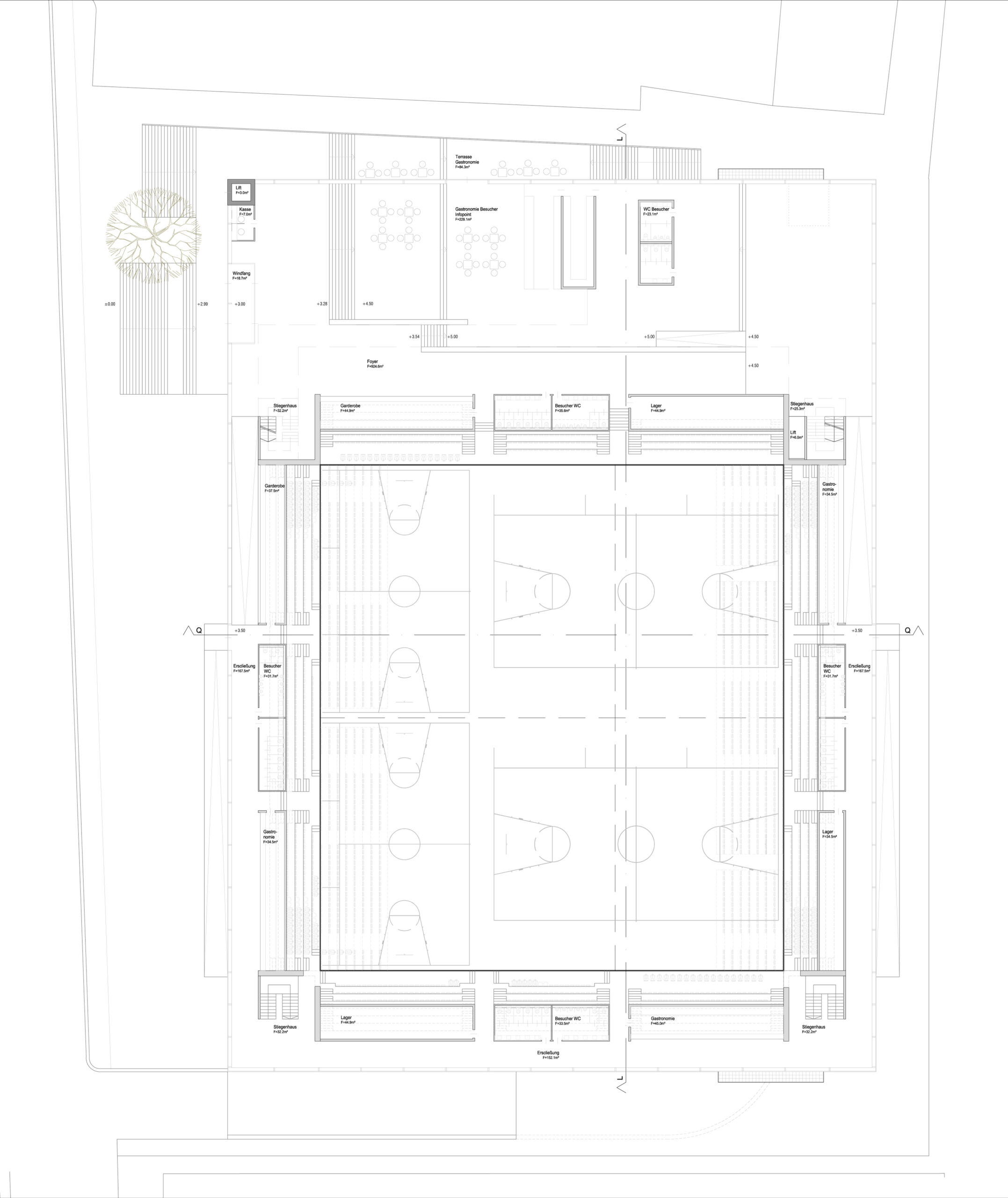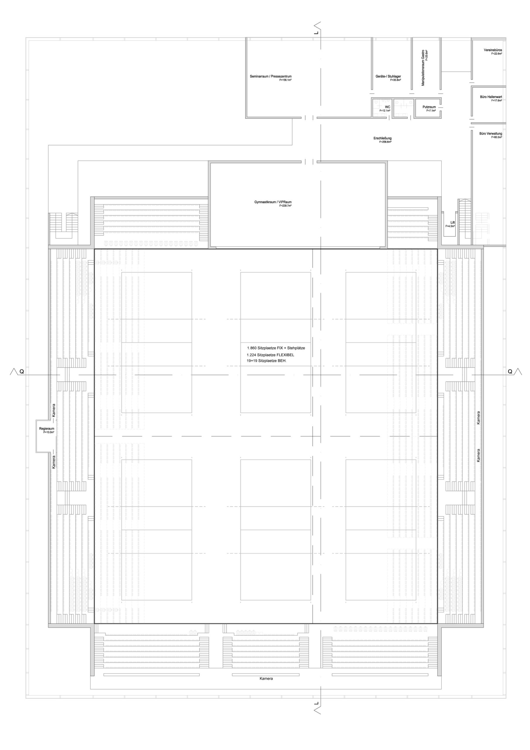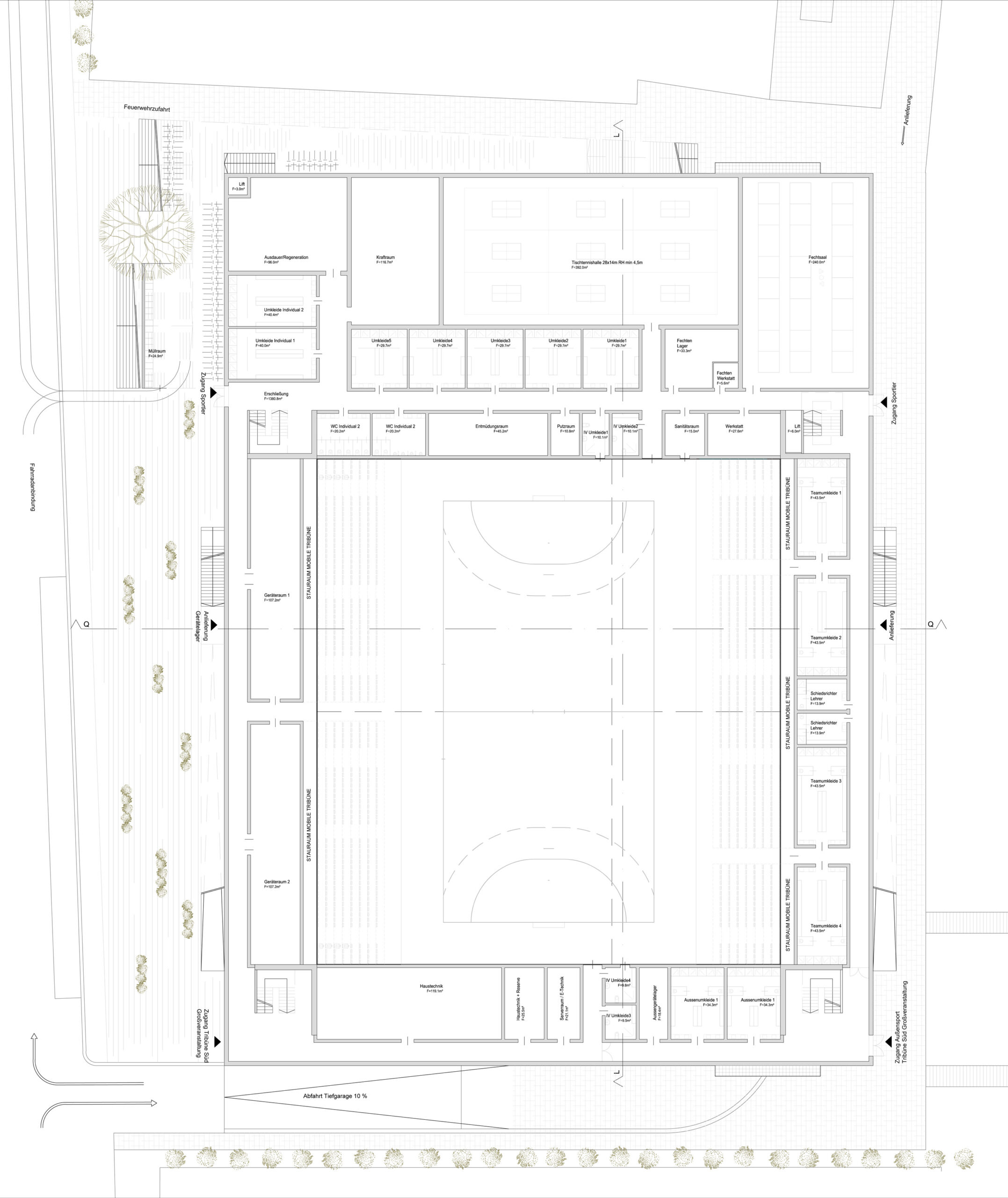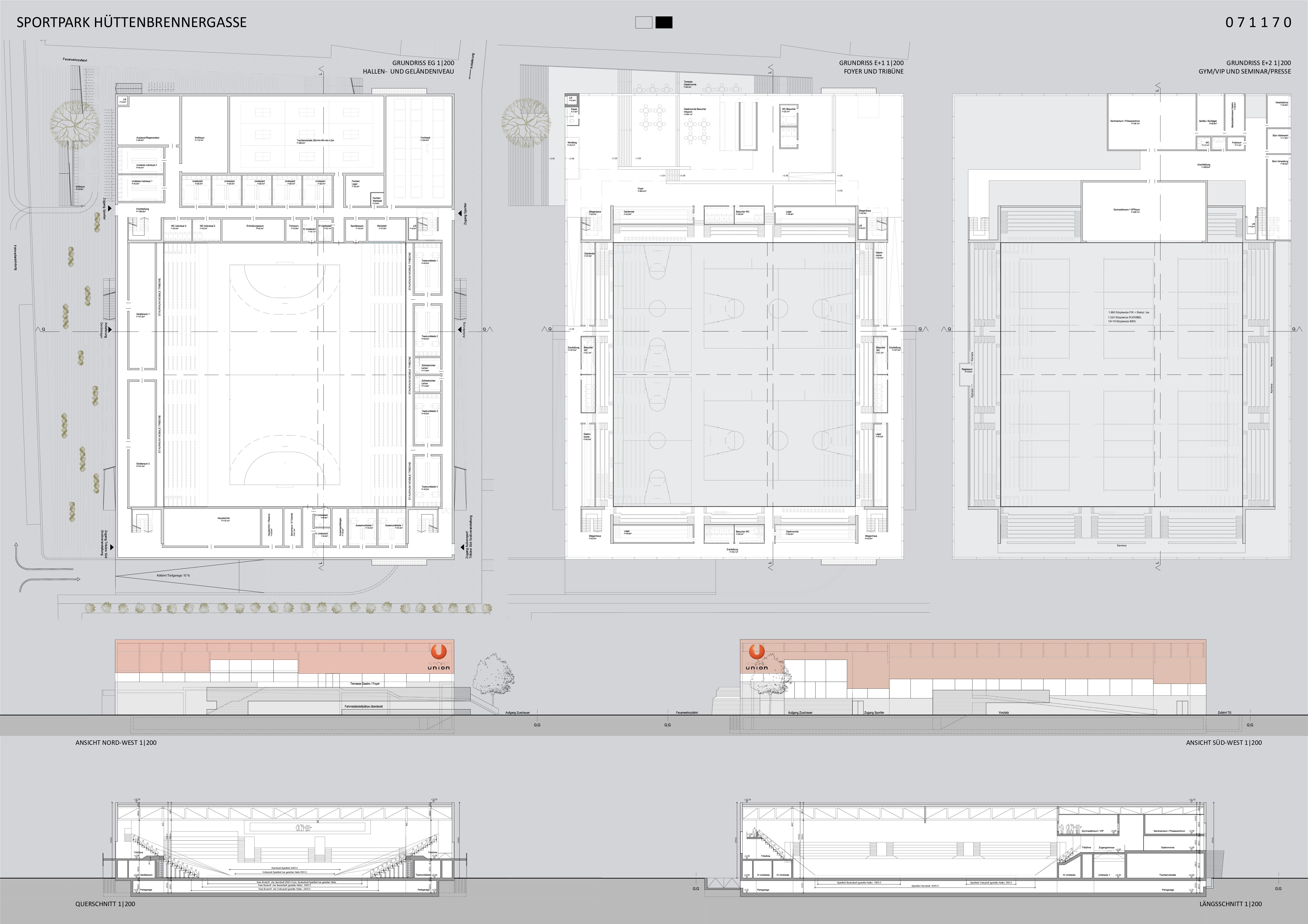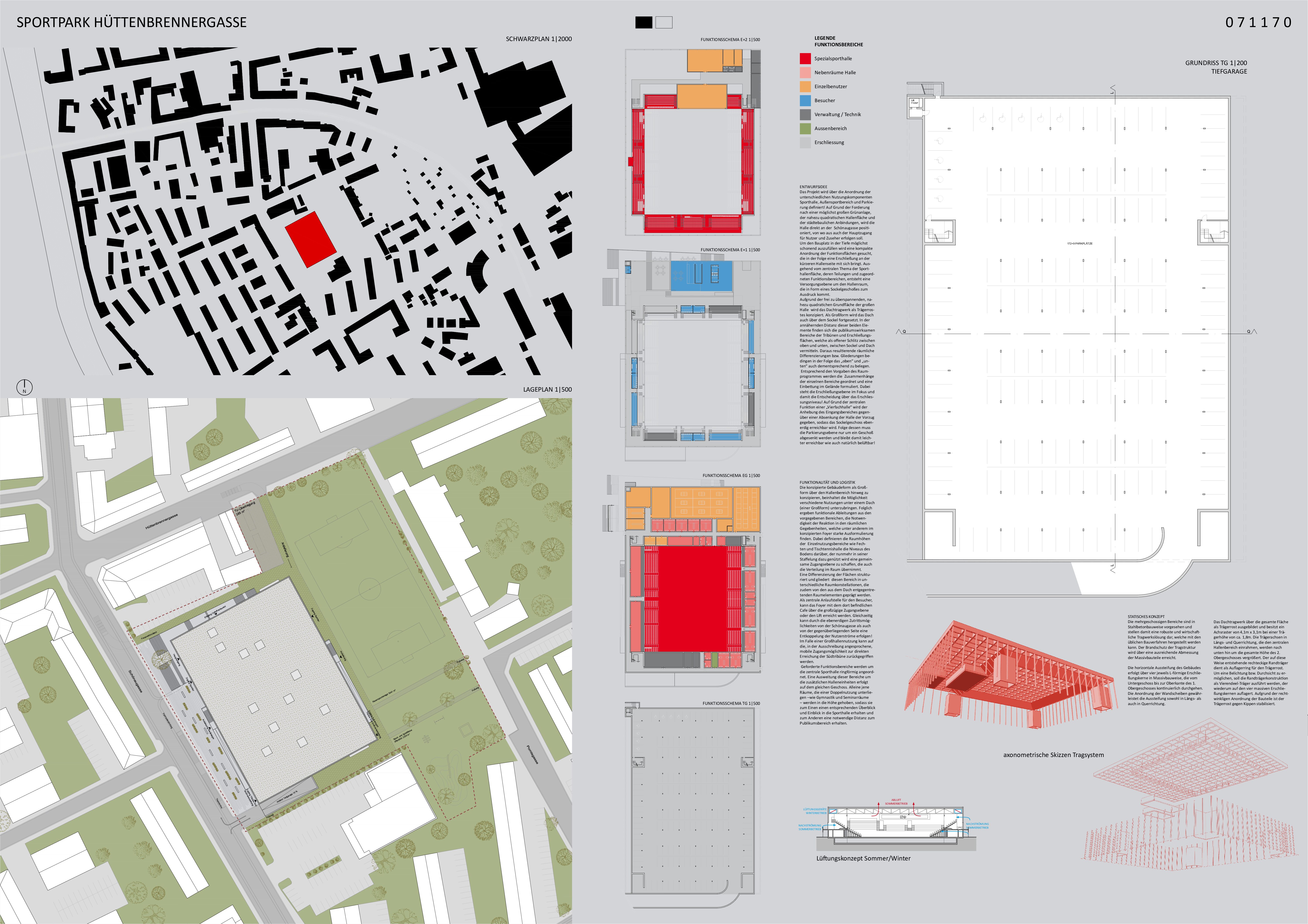 Das Projekt wird im Grunde definiert von der Entscheidung über die Anordnung der unterschiedlichen Nutzungskomponenten Sporthalle, Außensportbereich und Parkierung! Auf Grund der Forderung nach einer möglichst großen Grünanlage und der nahezu quadratischen Hallenfläche sowie der städtebaulichen Anbindungen wird dem Projekt die Lage an der Schönaugasse zugeordnet. Um den Bauplatz in der Tiefe möglichst schonend auszufüllen wird eine kompakte Anordnung der Funktionsflächen gesucht, die in der Folge eine Erschließung an der kürzeren Hallenseite mit sich bringt. Ausgehend vom zentralen Thema der Sporthallenfläche, deren Teilungen und zugeordneten Funktionsbereichen, entsteht eine Versorgungsebene um den Hallenraum, die in Form eines Sockelgeschoßes zum Ausdruck kommt. Aus Notwendigkeit der freien Überspannung der Sporthalle, wird die Dachform in Form eines Trägerrostes in seiner Ausweitung zur Großform über dem Sockel konzipiert. In der annähernden Distanz dieser beiden Elemente finden sich die publikumswirksamen Bereiche der Tribünen und Erschließungsflächen, welche als offener Schlitz zwischen oben und unten, zwischen Sockel und Dach vermitteln. Daraus resultierende räumliche Differenzierungen bzw. Gliederungen bedingen in der Folge das „oben“ und „unten“ auch dementsprechend zu belegen. Den Vorgaben des Raumprogrammes entsprechend werden die Zusammenhänge der einzelnen Bereiche formuliert und anschießend die Einbettung im Gelände diskutiert. Dabei steht die Erschließungsebene im Fokus und damit die Entscheidung über die Art der Erhebung oder Absenkung! Auf Grund der zentralen Funktion einer „Vierfachhalle“ wird der Anhebung des Eingangsbereiches gegenüber einer Absenkung der Halle der Vorzug gegeben, sodass das Sockelgeschoss ebenerdig erreichbar wird. Folge dessen muss die Parkierungsebene nur um ein Geschoß abgesenkt werden und bleibt damit leichter erreichbar wie auch natürlich belüftbar.