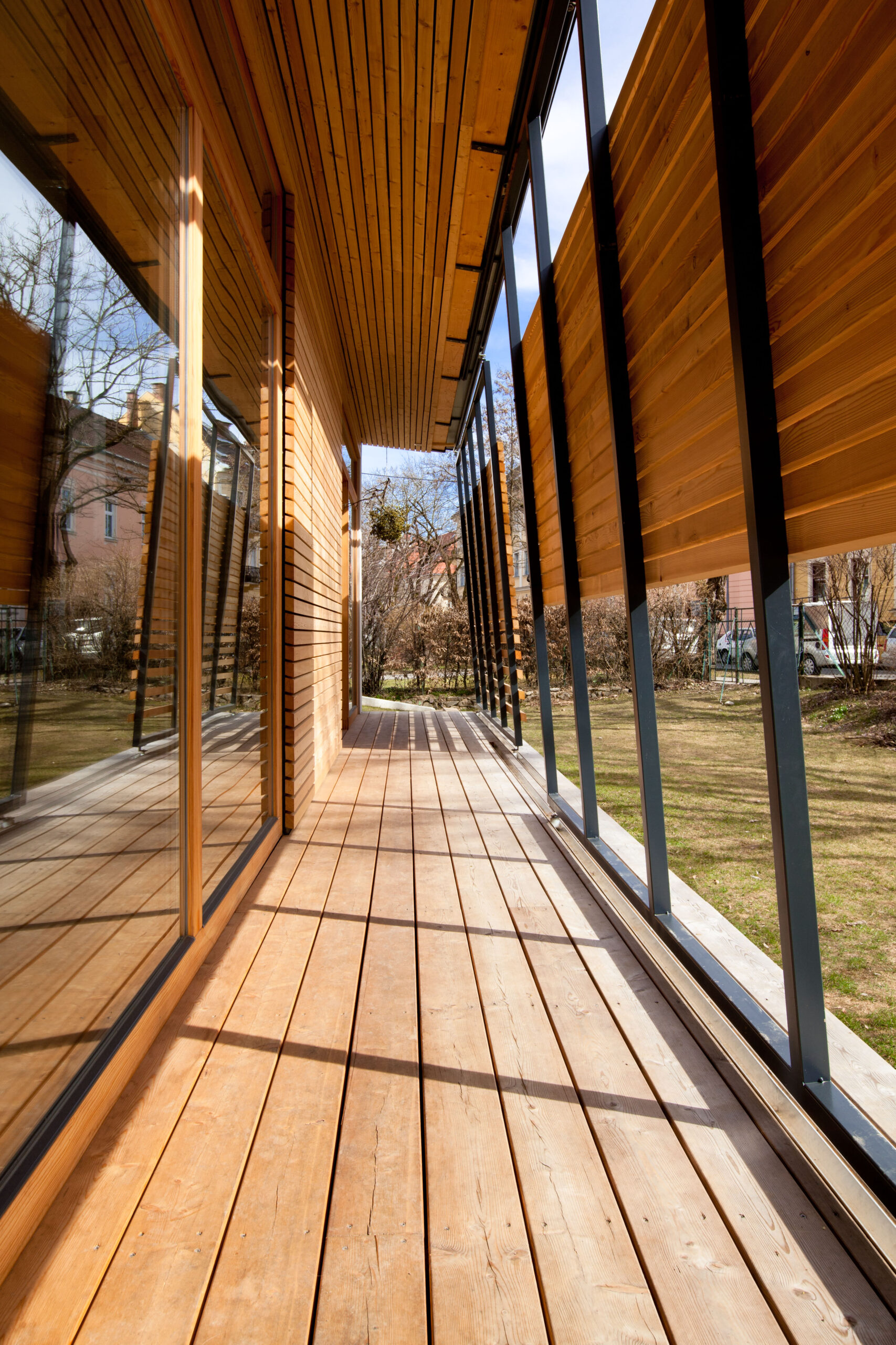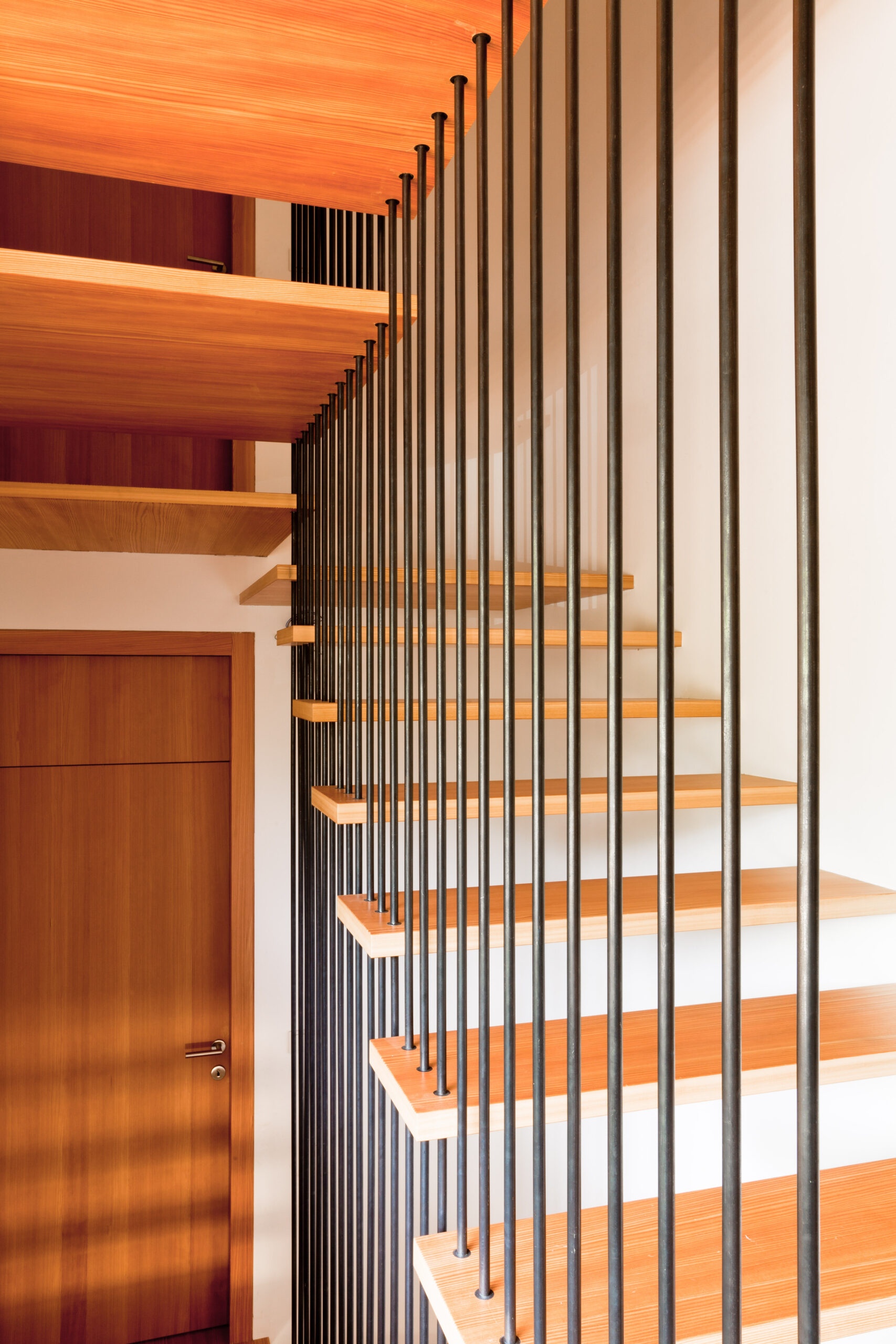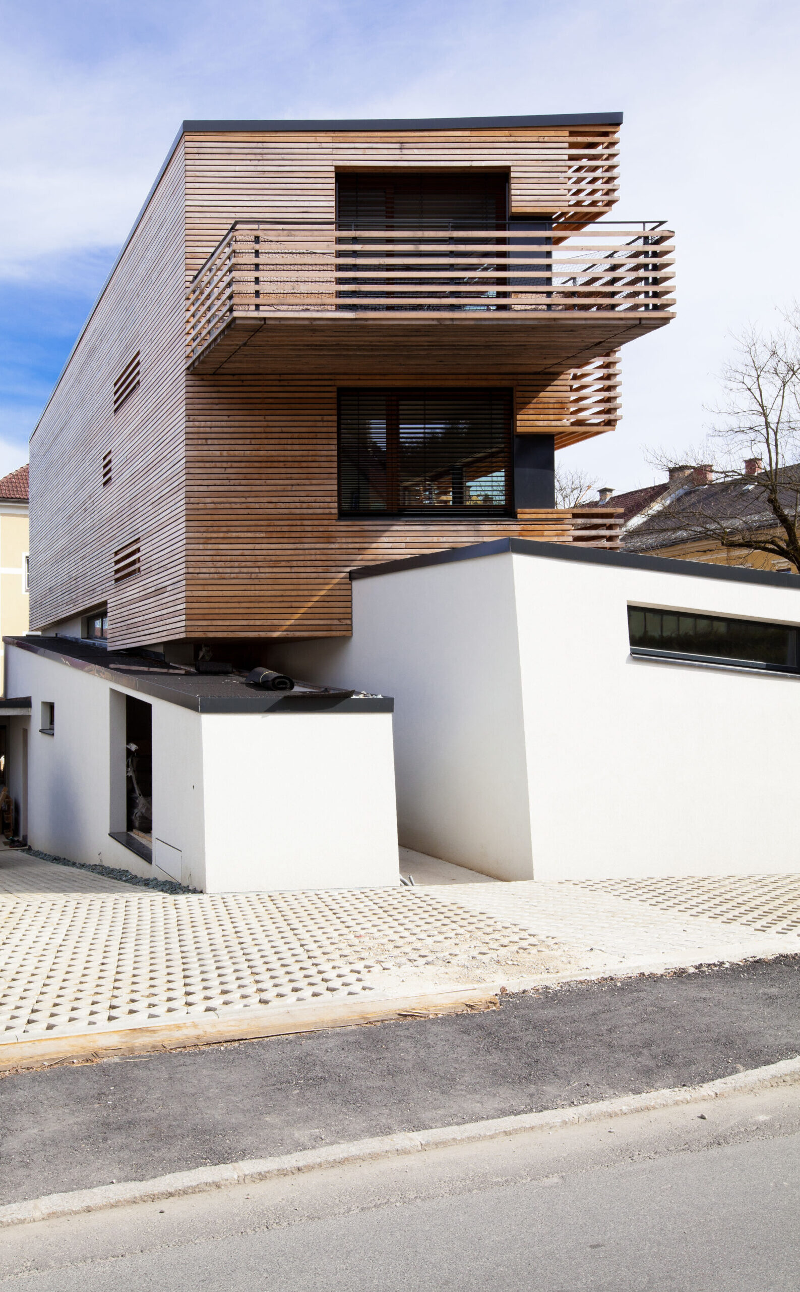Vor dem Hintergrund einer städtischen Lage, unweit des Stadtzentrums aber in grüner Um- gebung, die Komplexität der Erwartungshal- tung übertreffen und somit die Ausformulierung zu einer Besonderheit stilisieren. Wenn man von Lage spricht, meint man die Platzierung, wenn die Ausrichtung zum Thema wird, bemüht man sich der Ausnützung von Sonnenständen, worüber spricht man aller- dings beim Erscheinungsbild eines Hauses? Wie sieht die „gewünschte“ dritte Haut aus? Im Geforderten finden sich die Befindlichkeiten der Bewohner, in den Ansprüchen die Urteils- kräfte und in der Bewertung die Umgangs- formen! Das Haus kann also dann alles Gut, wenn man das Falsche einfach weglässt, frei nach Leo- nardo d. V. übersetzt und könnte somit nicht besser sein, wenn man nur das Gute ausführt. Im Idealfall ist es aber nicht der emotionale Seufzer der Bauherrin über das verloren ge- glaubte „Landhaus der Toskana“, sondern die Erarbeitung der maßgeschneiderten Struktur für den vorgegebenen Raum. Die Raumde- finition liegt nunmehr in der Ergänzung der Funktion durch die Vorstellung über den Raum! Eine gegenseitige Befruchtung entbindet die Möglichkeiten der Formulierung zur endgül- tigen Form! Das Gebäude stellt sich selbstbewusst und gleichzeitig die städtebauliche Situation achtend, an die nördliche Grundstücksgren- ze, verlegt die Zufahrt an die Westseite und minimiert somit den Störungseinfluss auf der südlichen Gartenfläche! Der vorgefundenen Geländeformation folgend, entwickelt sich das Haus über die verschiedenen Niveaus vom Garten weg nach oben. Dabei spielt vor allem für den erdgeschossigen Teil die Zuordnung zum Außenraum und die mögliche barriere- freie Bewohnbarkeit eine wesentliche Rolle!
